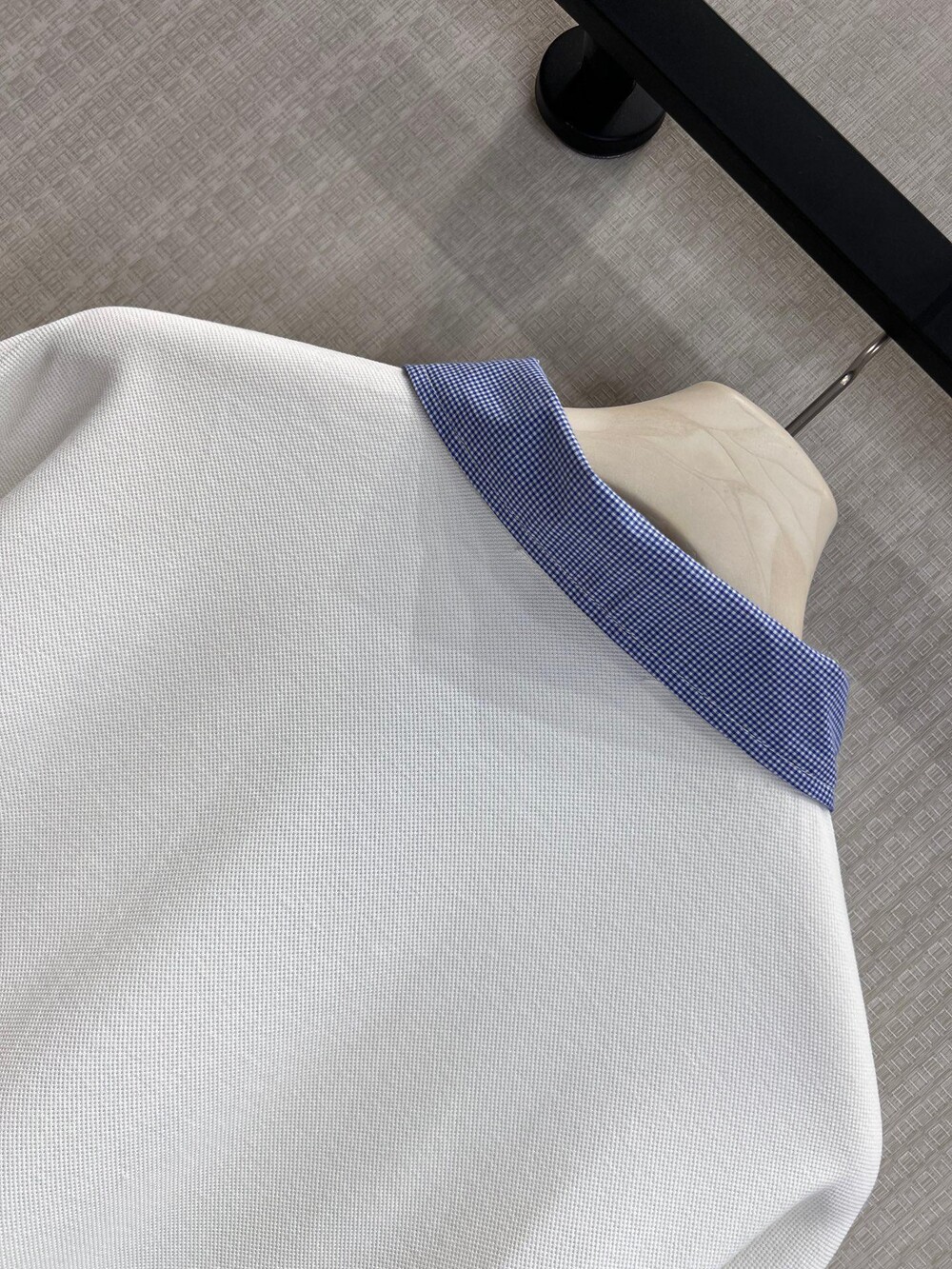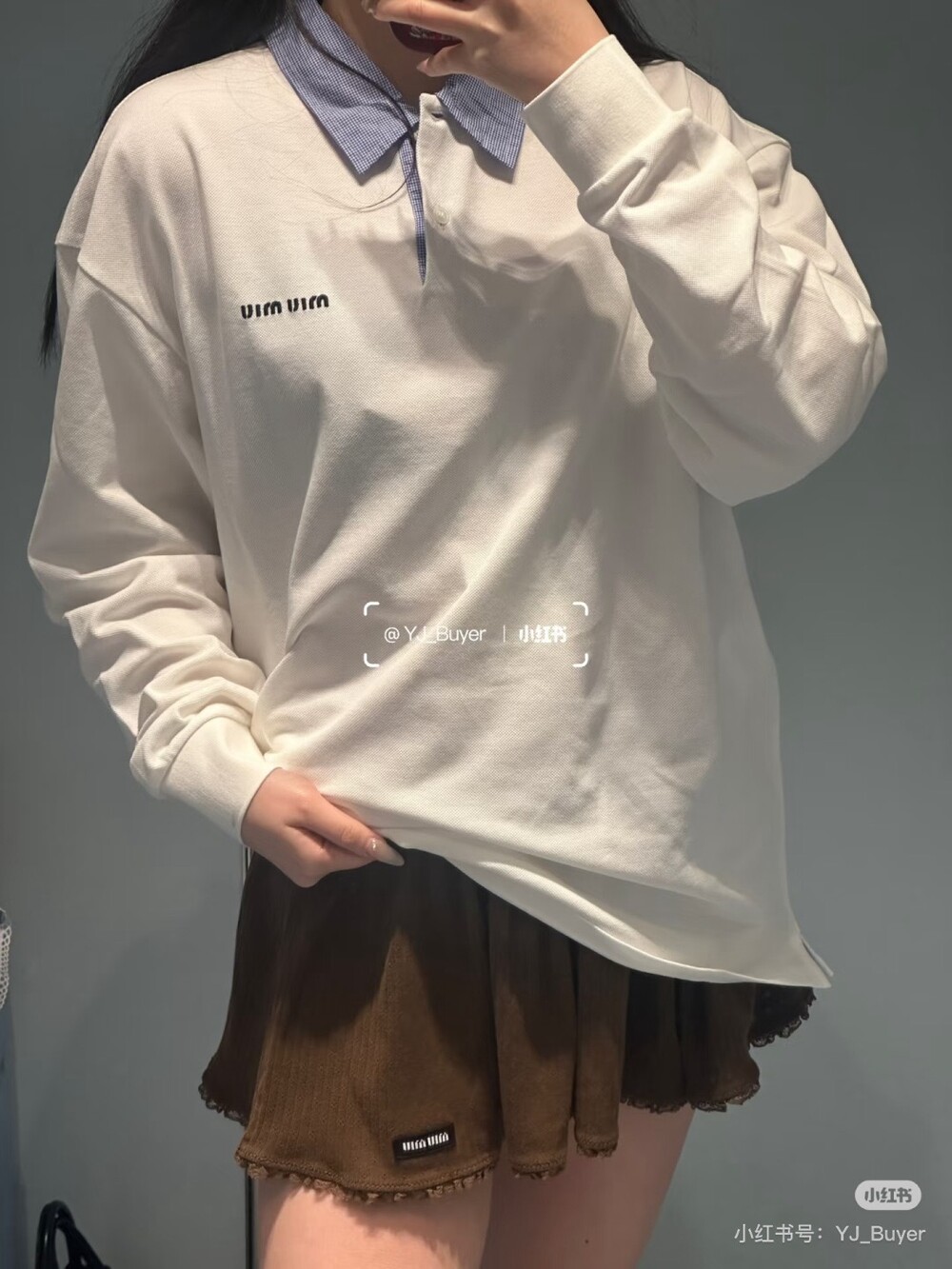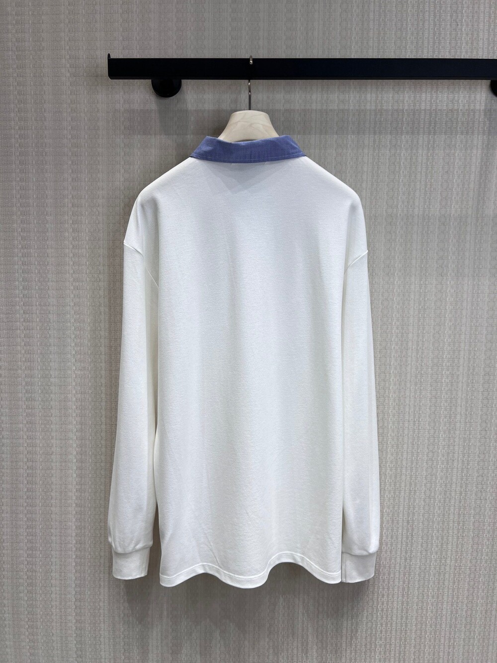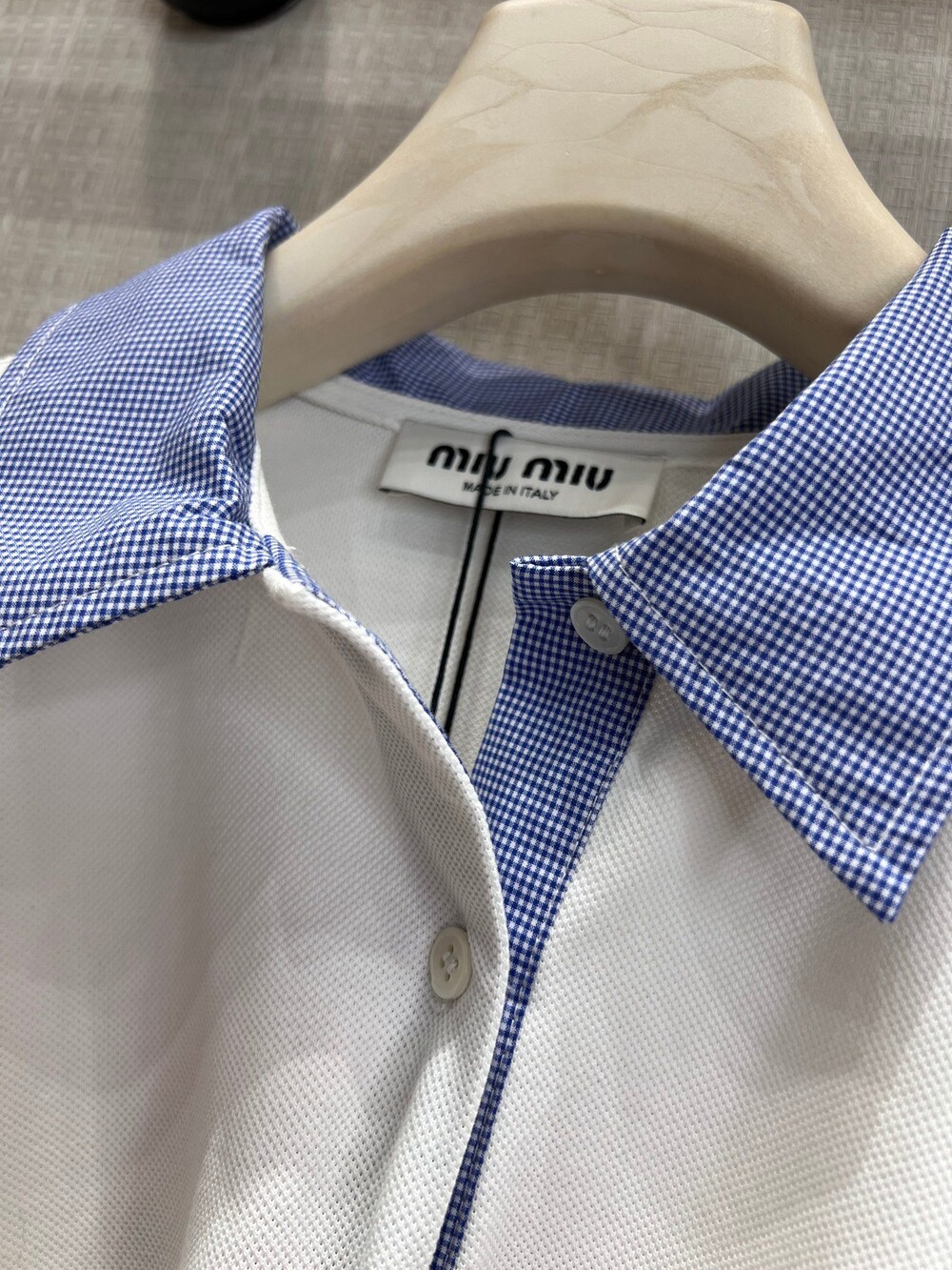 미우미우의 아이코닉한 감성이 담긴 이 코튼 피케 폴로 셔츠는 로고 자수 장식과 남성복에서 영감을 받은 체크 포플린 칼라가 특징으로, 룩에 세련된 개성을 더합니다.