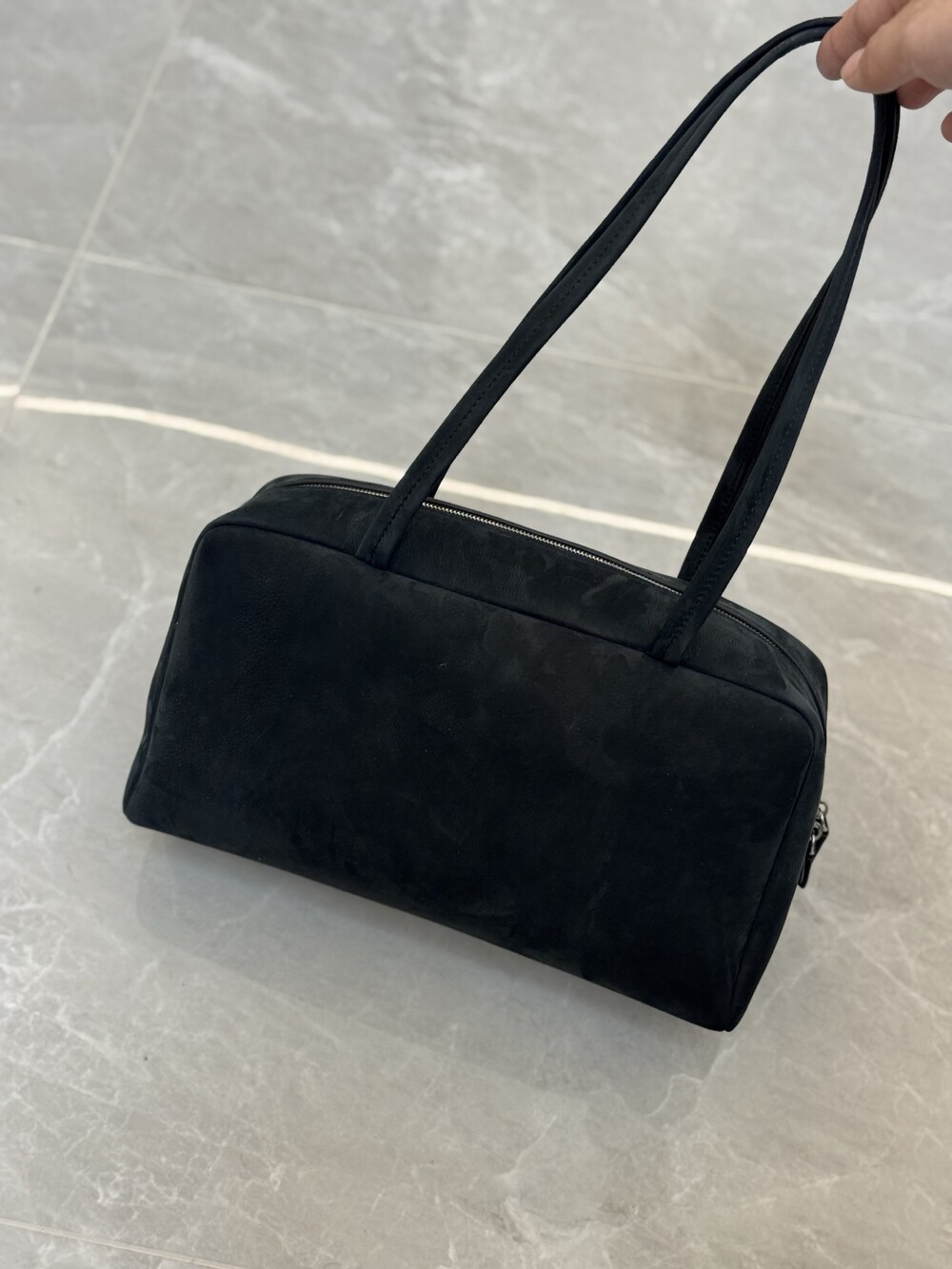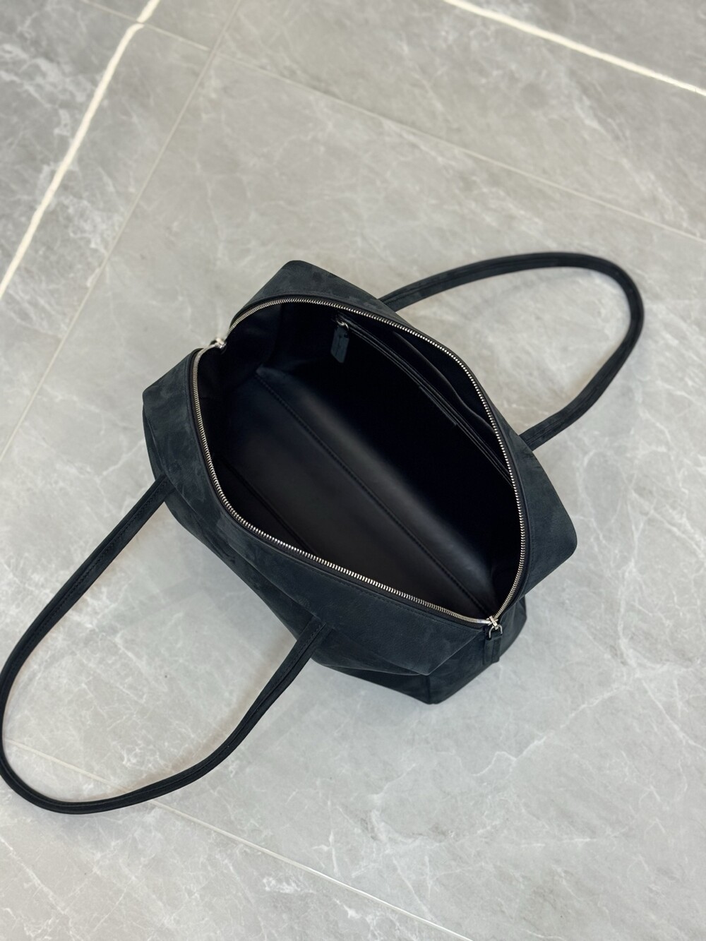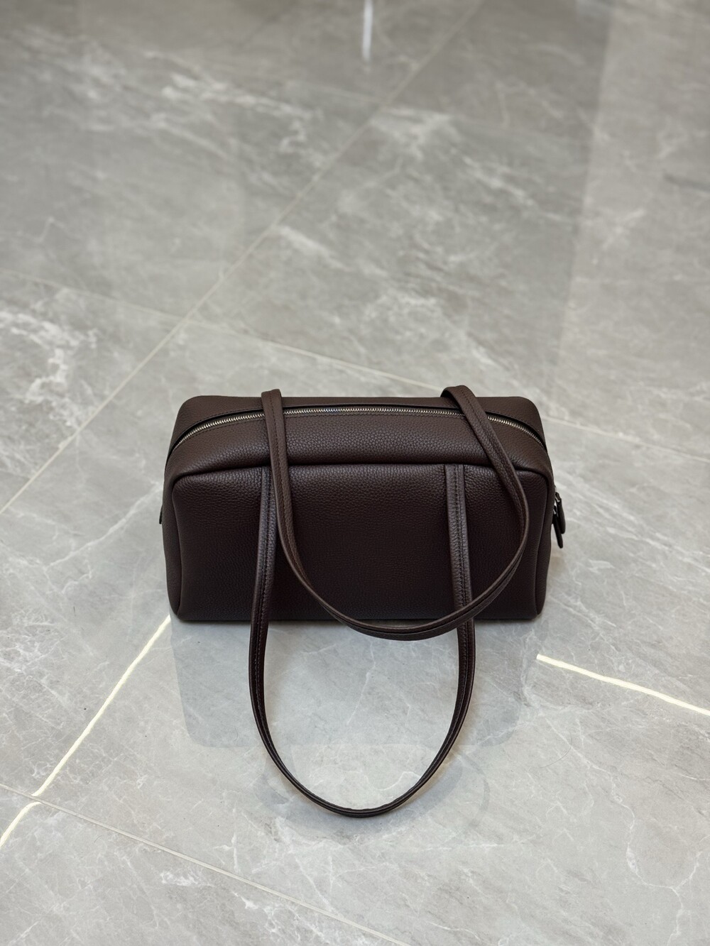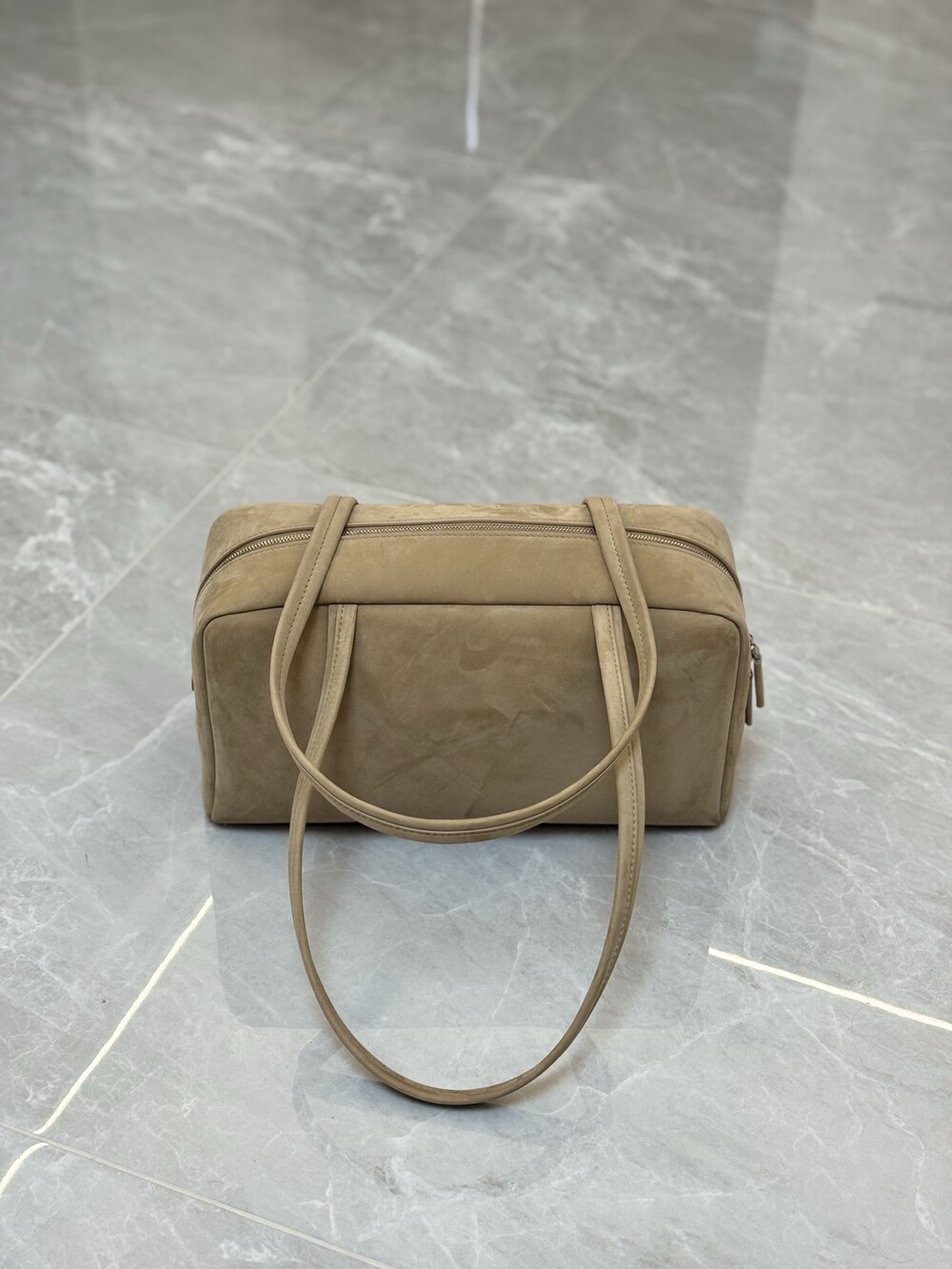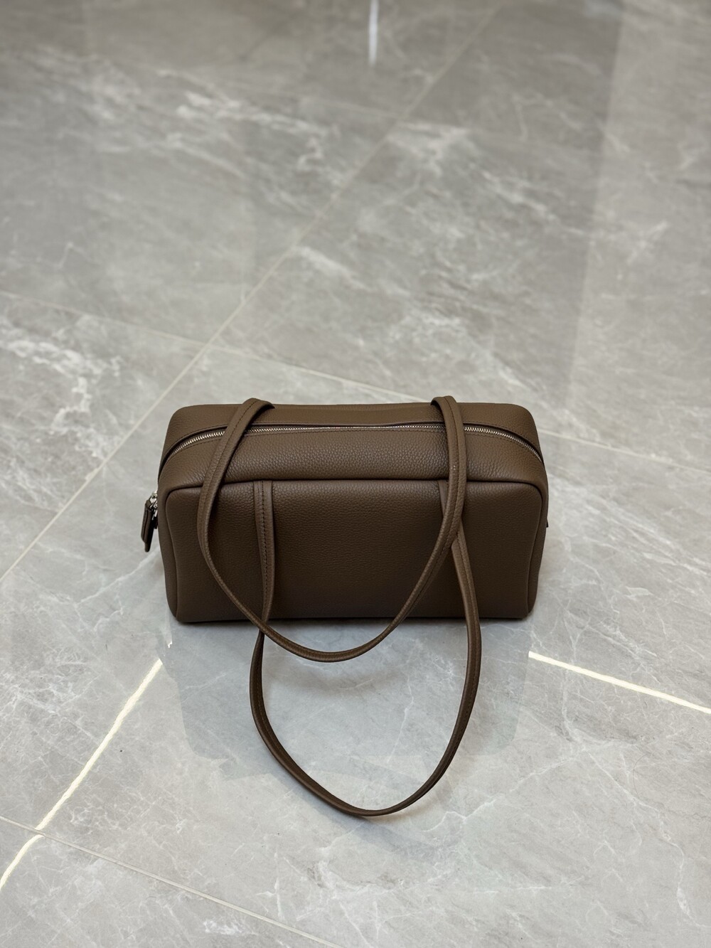 둥근 가장자리 구조, 긴 플랫 핸들과 듀얼 지퍼 클로저가 특징인 부드러운 가죽 소재의 소프트 볼링 백. 자연스러운 그레인의 표면을 가볍게 닦아내 세련된 스웨이드 느낌을 연출했습니다.