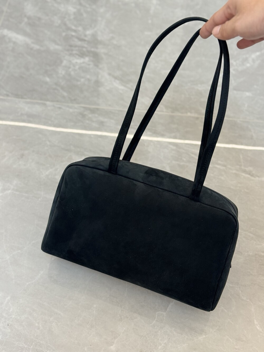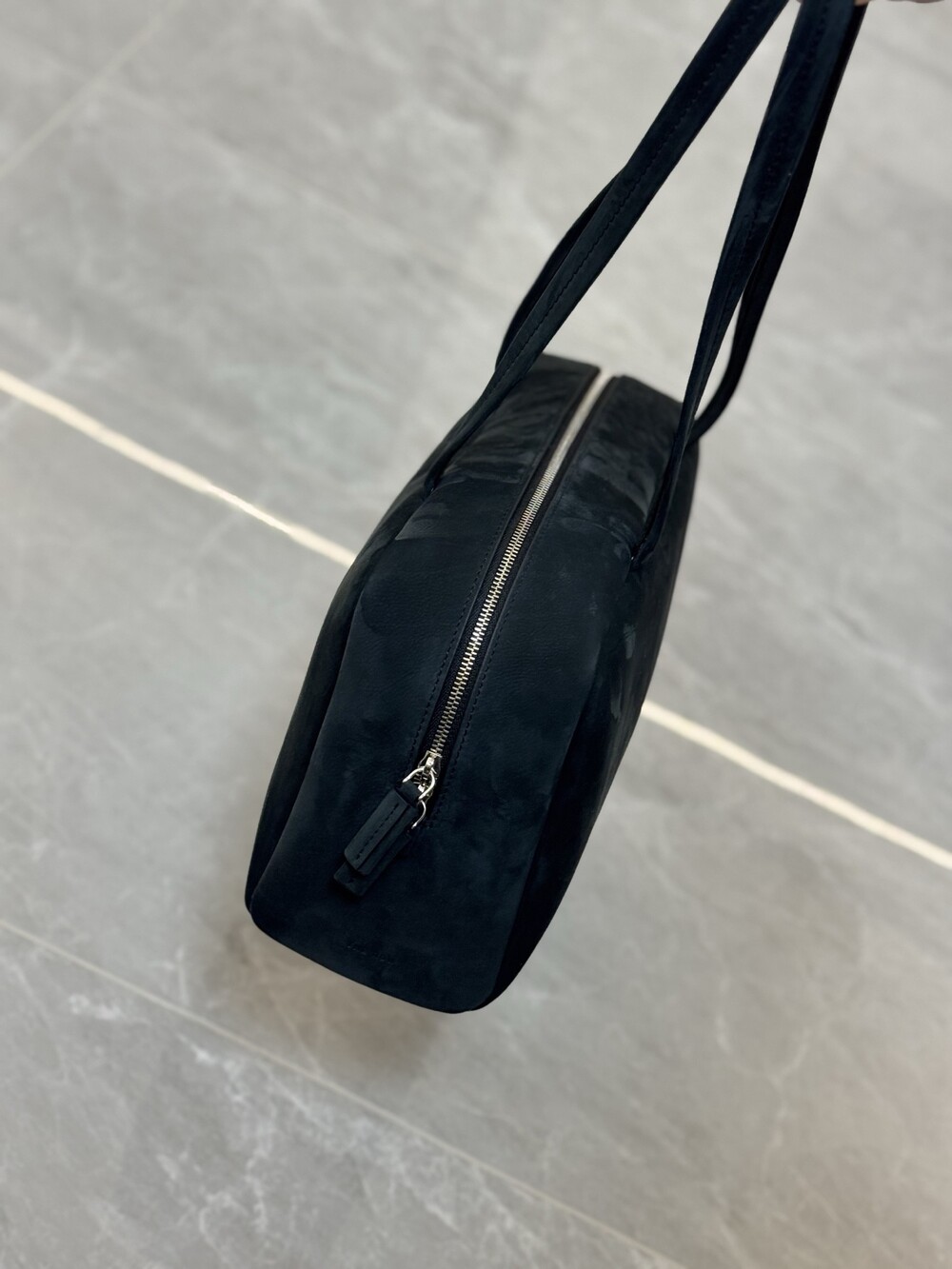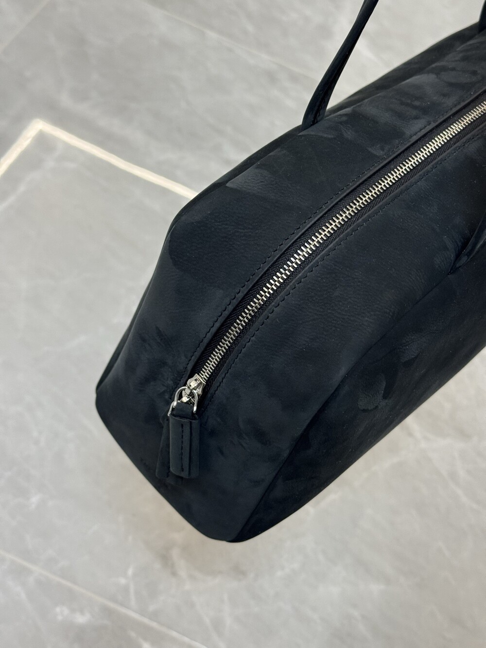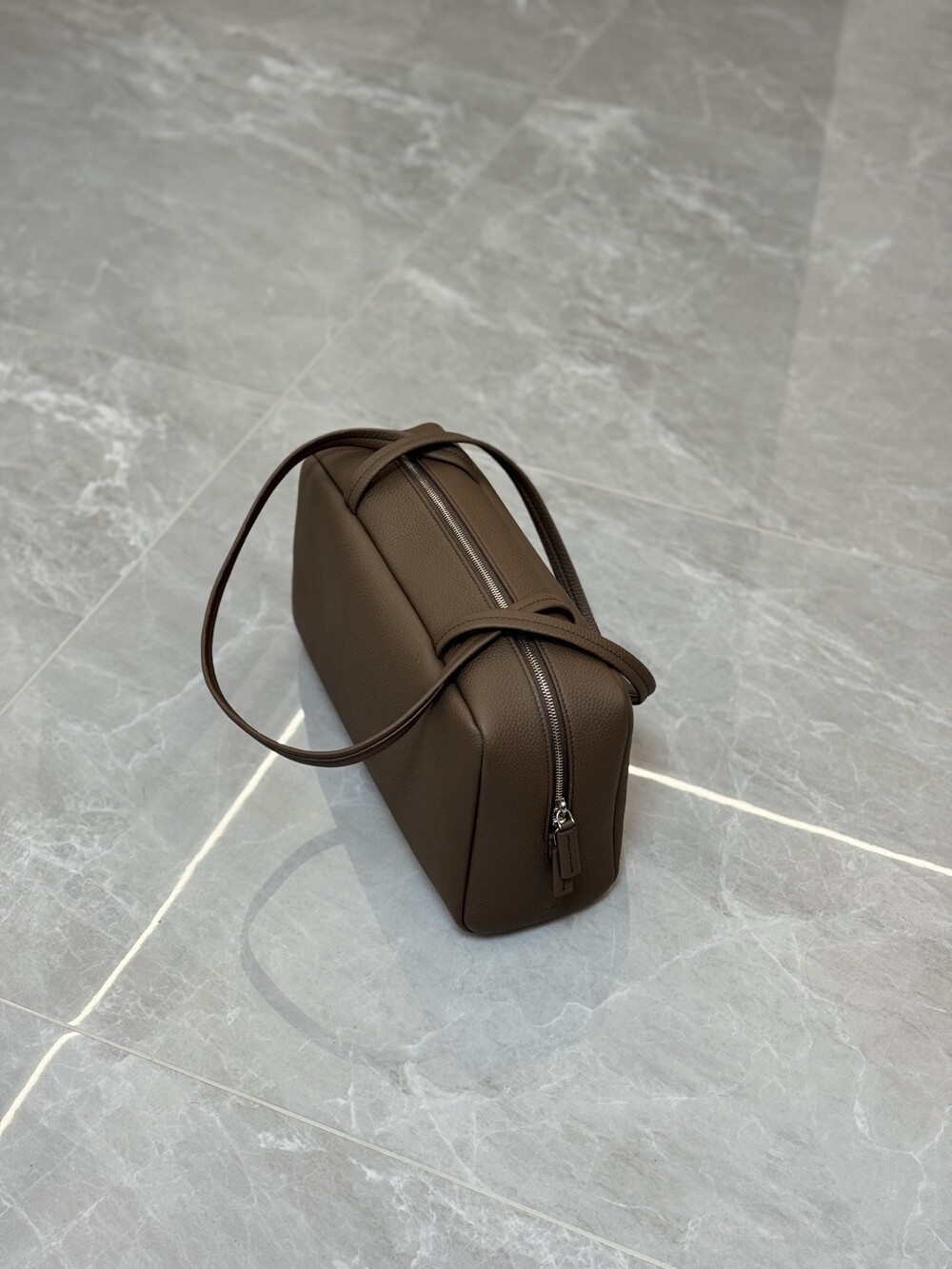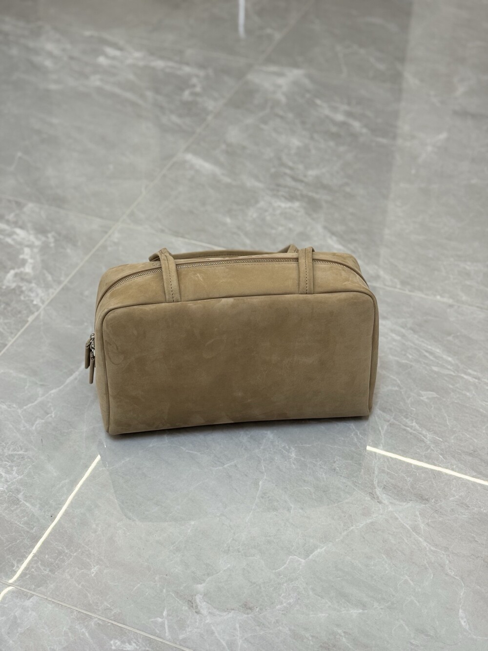 둥근 가장자리 구조, 긴 플랫 핸들과 듀얼 지퍼 클로저가 특징인 부드러운 가죽 소재의 소프트 볼링 백. 자연스러운 그레인의 표면을 가볍게 닦아내 세련된 스웨이드 느낌을 연출했습니다.