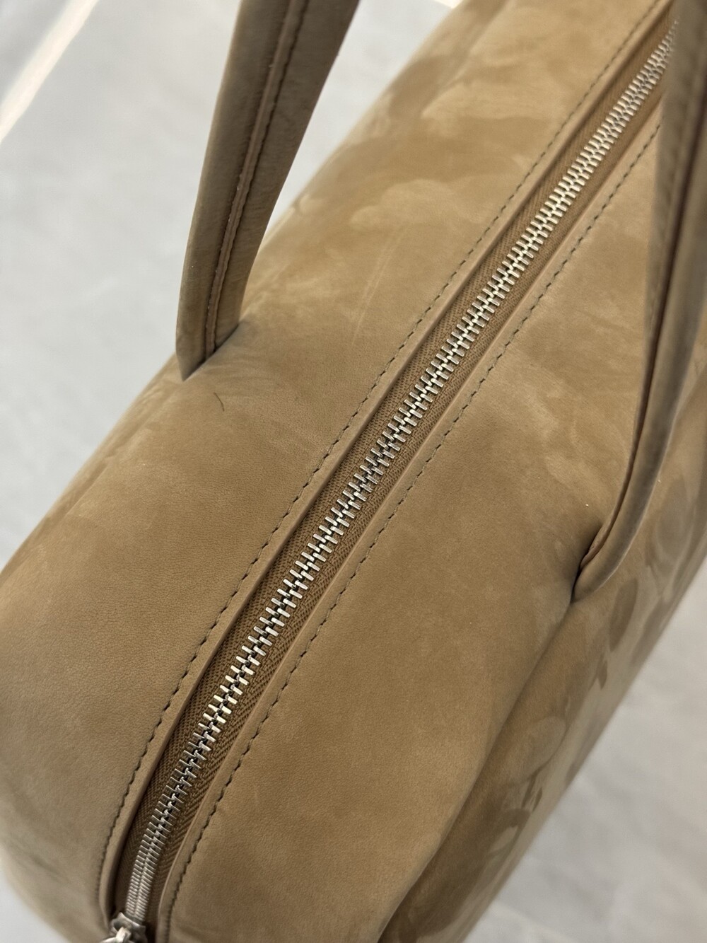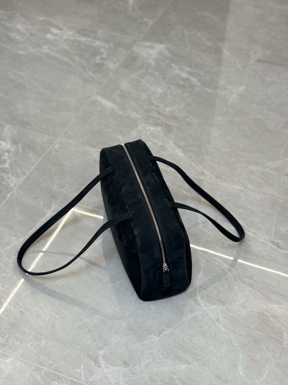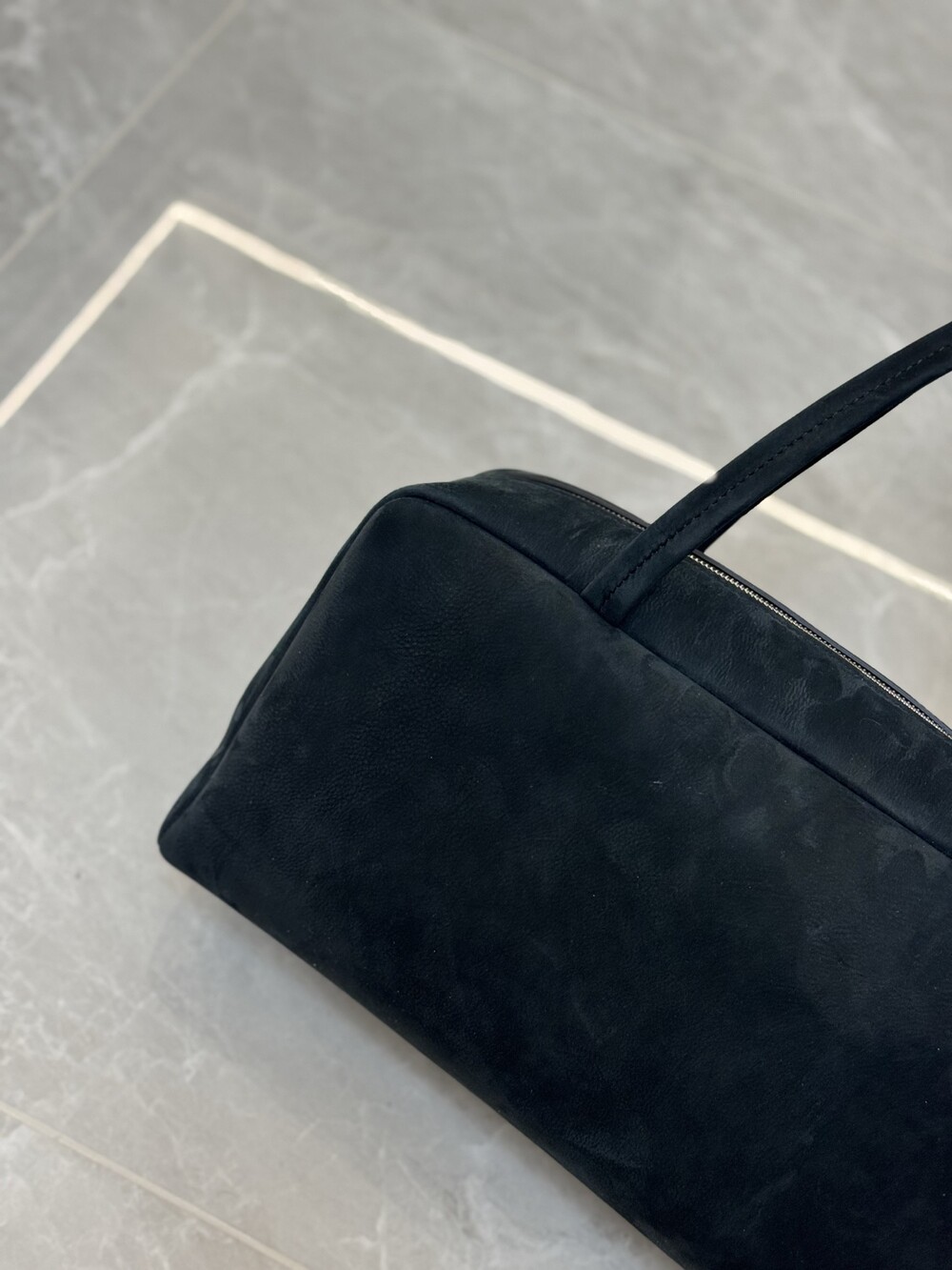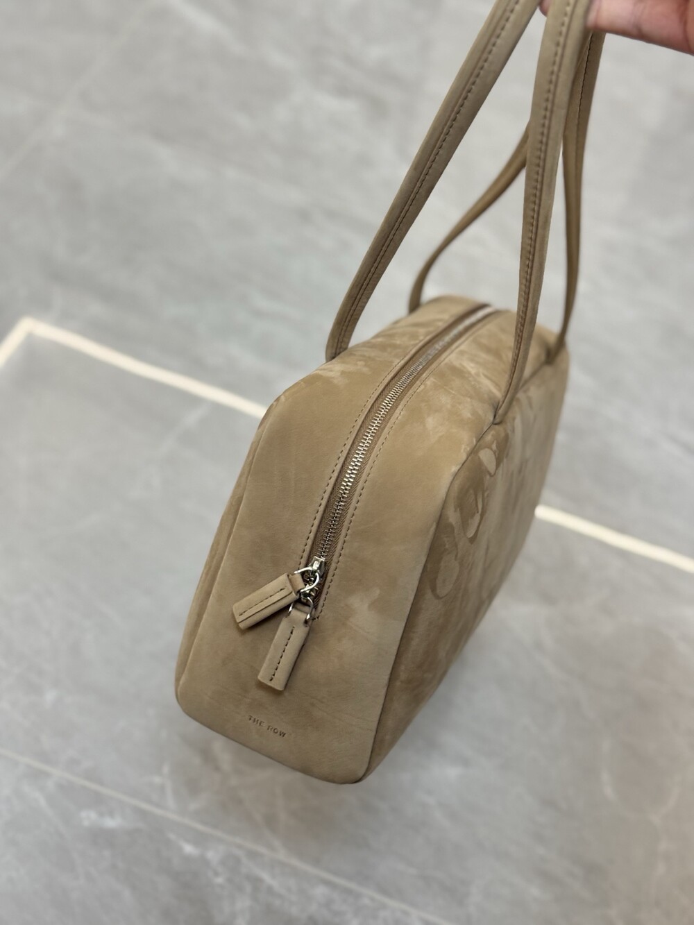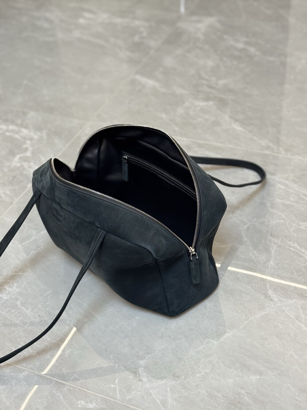 둥근 가장자리 구조, 긴 플랫 핸들과 듀얼 지퍼 클로저가 특징인 부드러운 가죽 소재의 소프트 볼링 백. 자연스러운 그레인의 표면을 가볍게 닦아내 세련된 스웨이드 느낌을 연출했습니다.