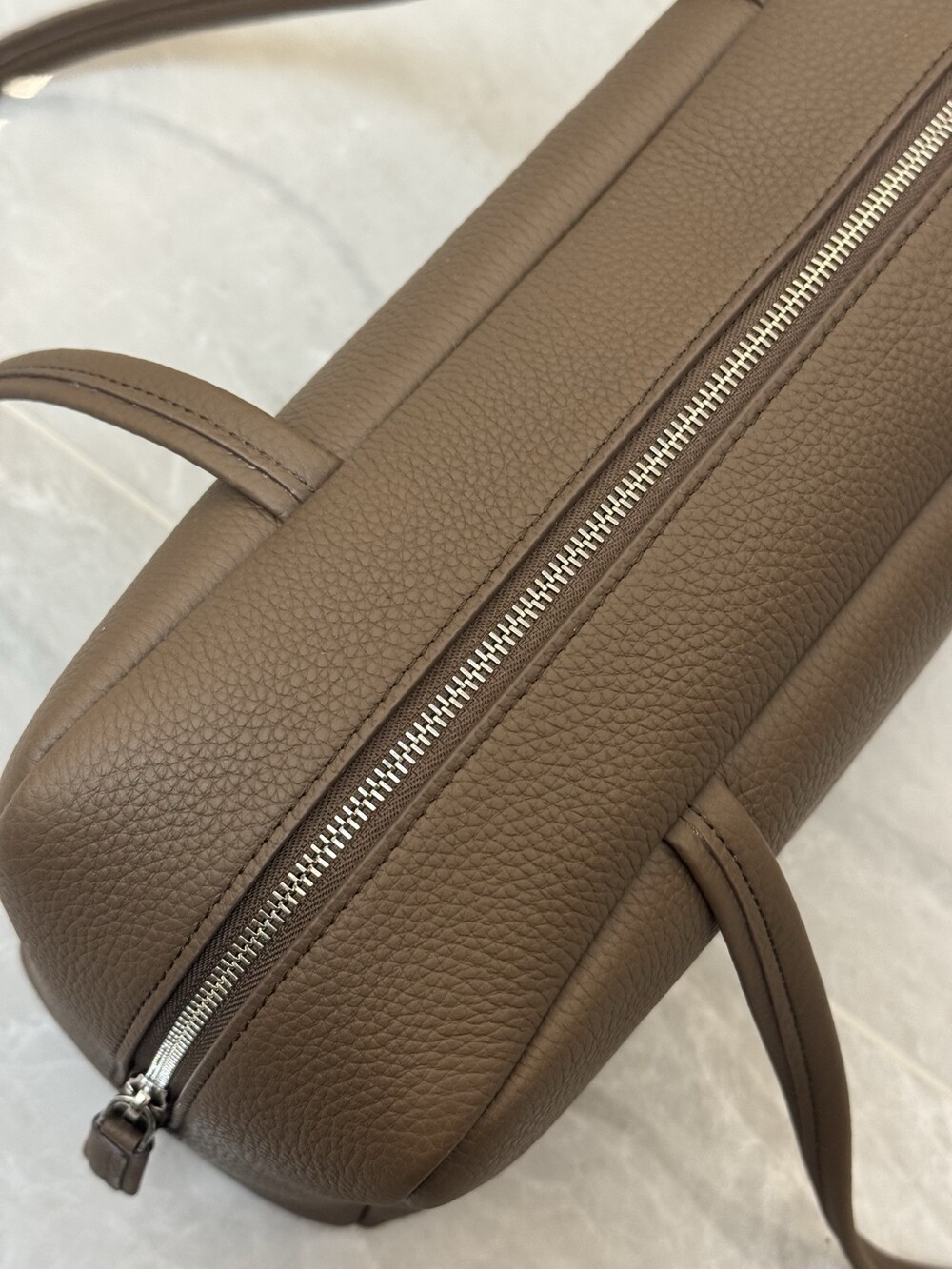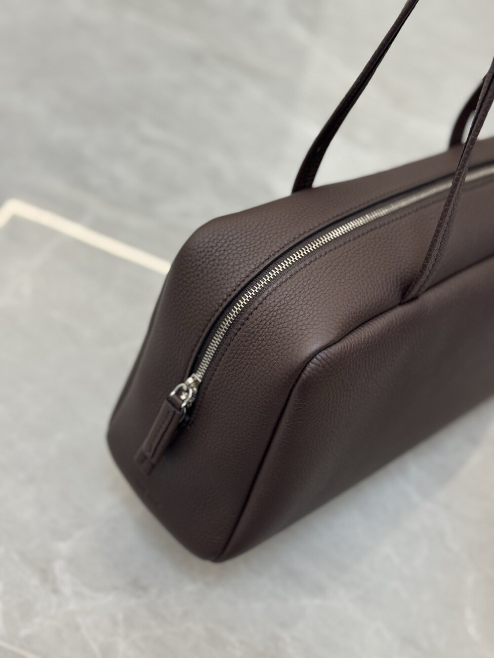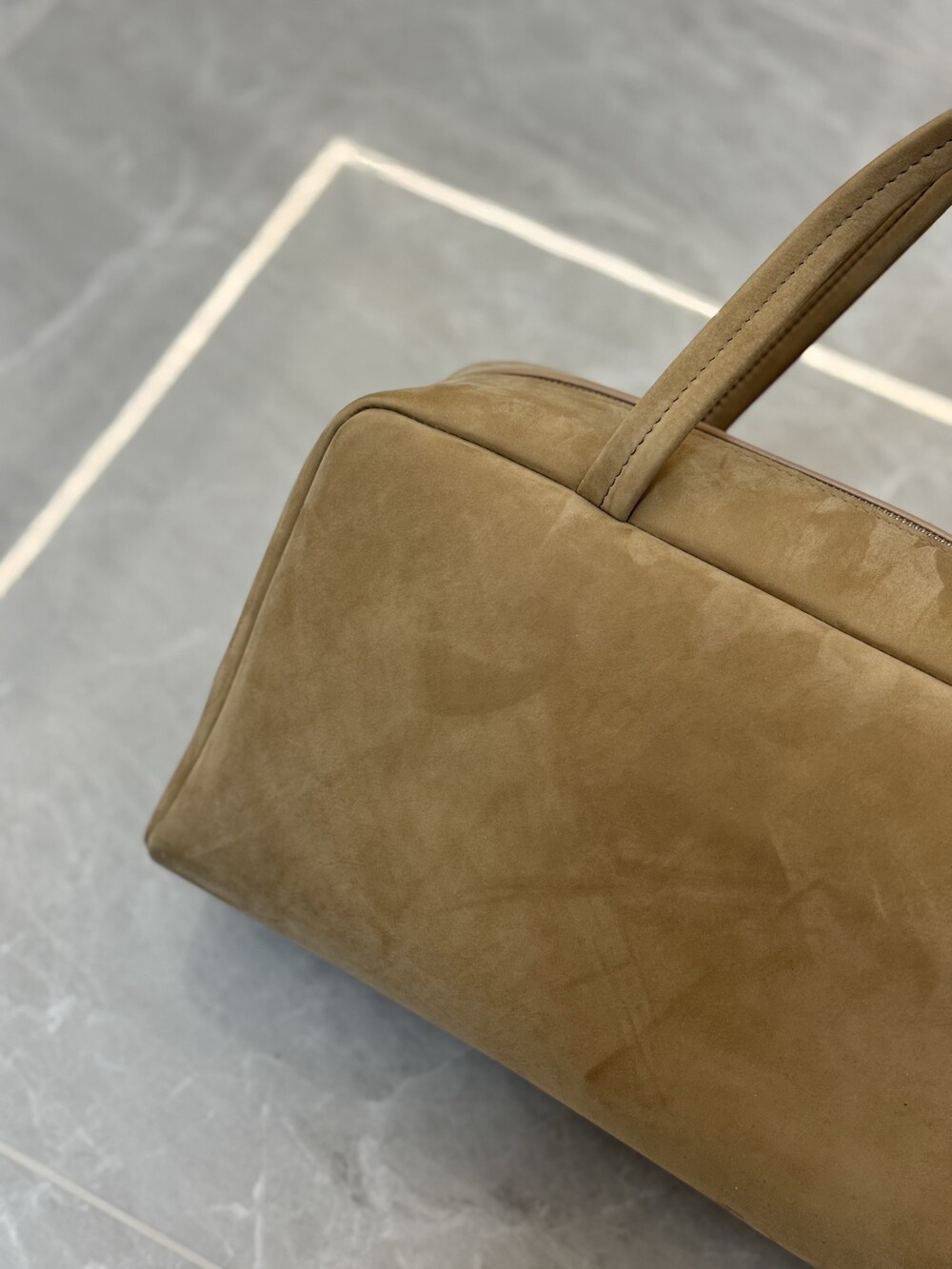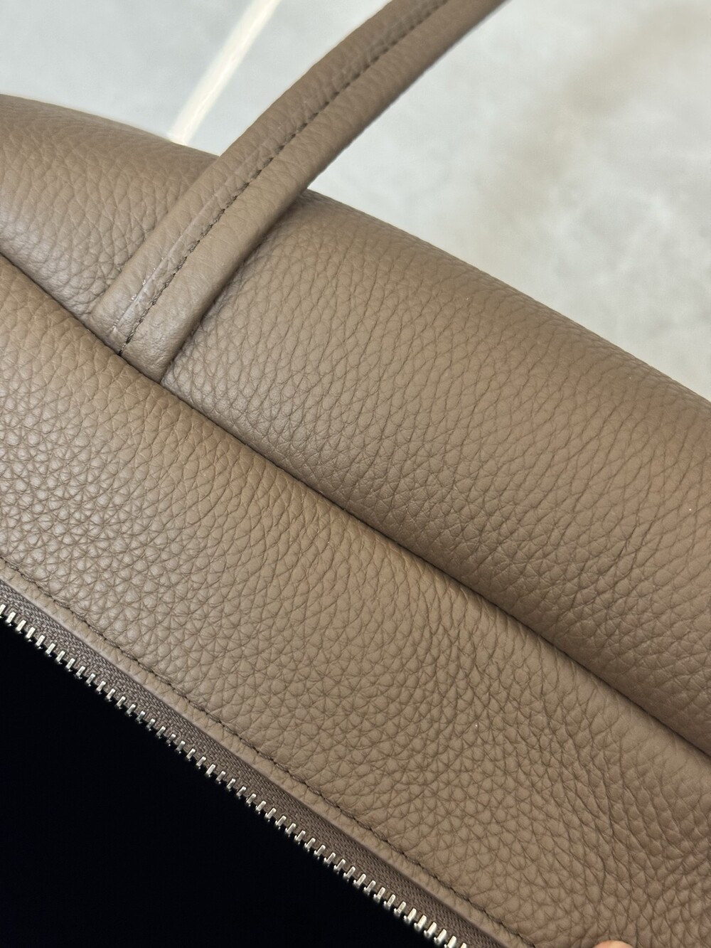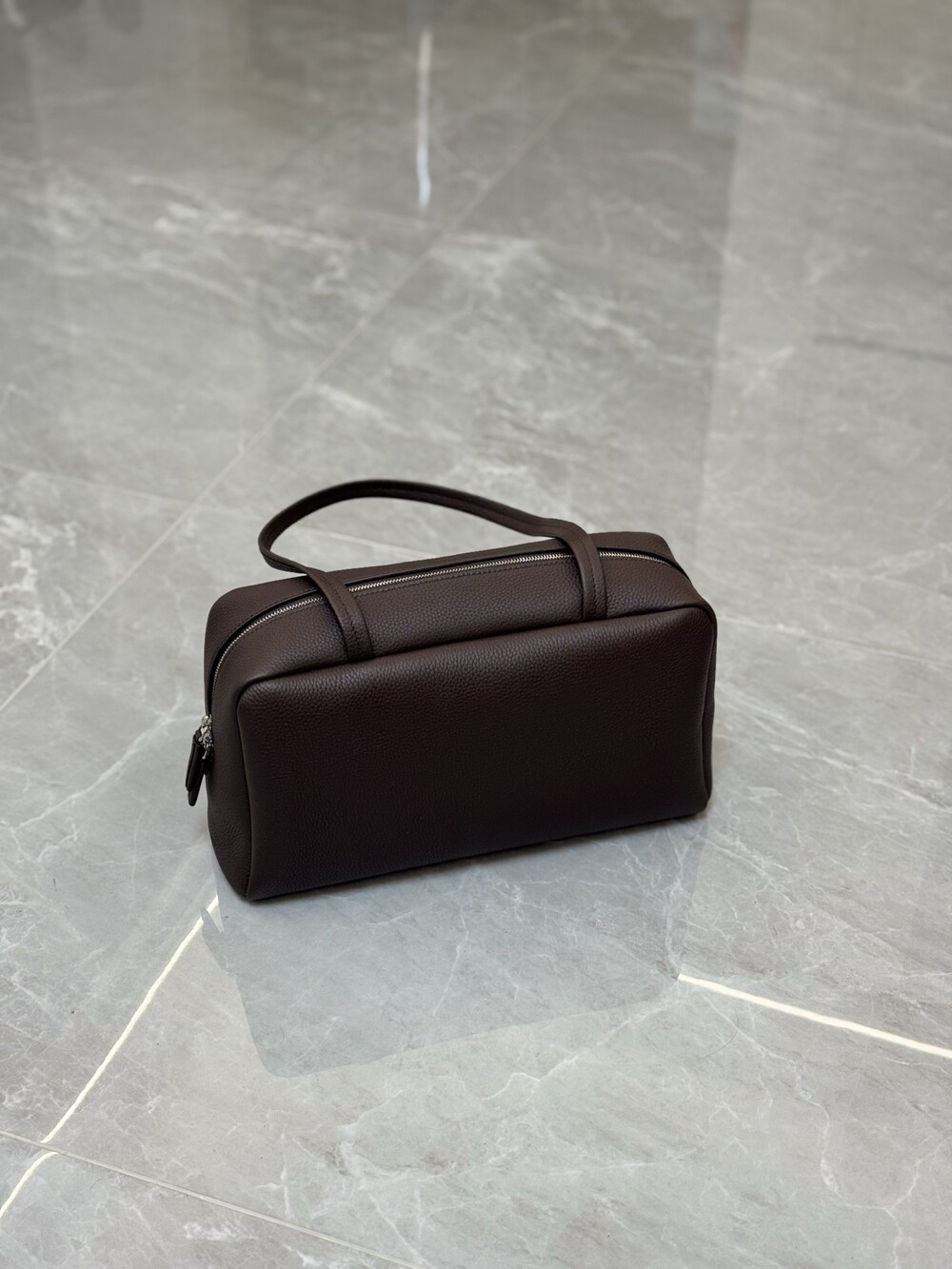 둥근 가장자리 구조, 긴 플랫 핸들과 듀얼 지퍼 클로저가 특징인 부드러운 가죽 소재의 소프트 볼링 백. 자연스러운 그레인의 표면을 가볍게 닦아내 세련된 스웨이드 느낌을 연출했습니다.