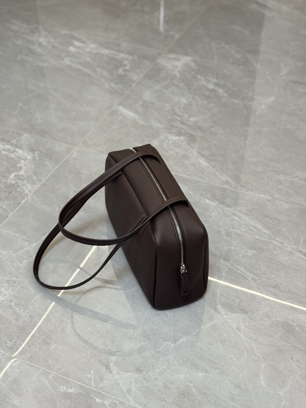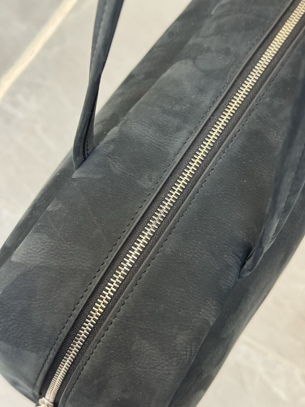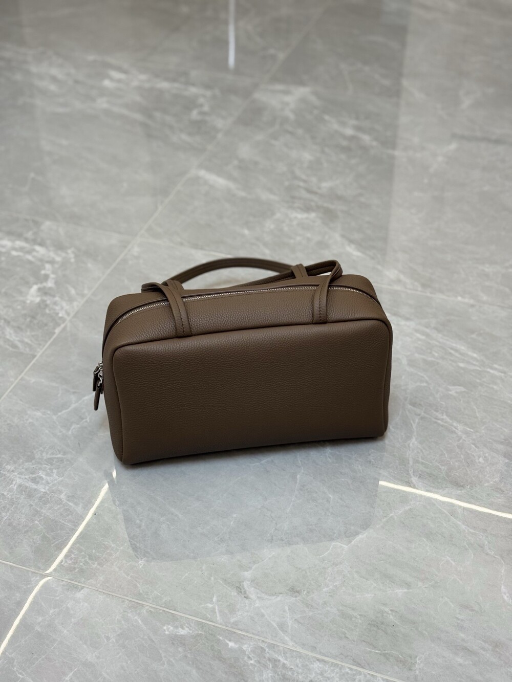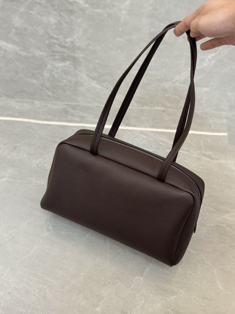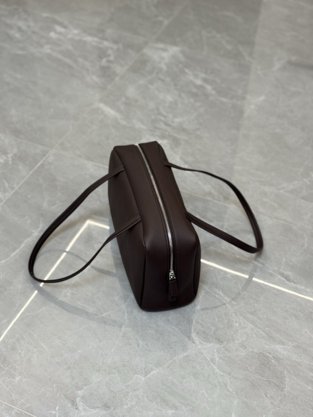 둥근 가장자리 구조, 긴 플랫 핸들과 듀얼 지퍼 클로저가 특징인 부드러운 가죽 소재의 소프트 볼링 백. 자연스러운 그레인의 표면을 가볍게 닦아내 세련된 스웨이드 느낌을 연출했습니다.