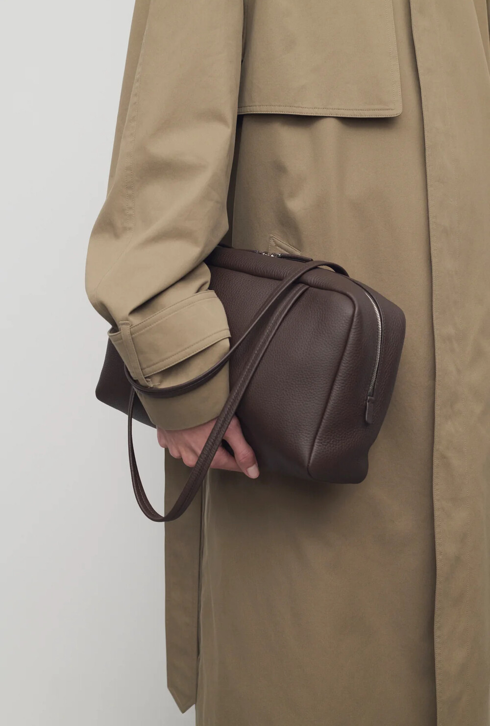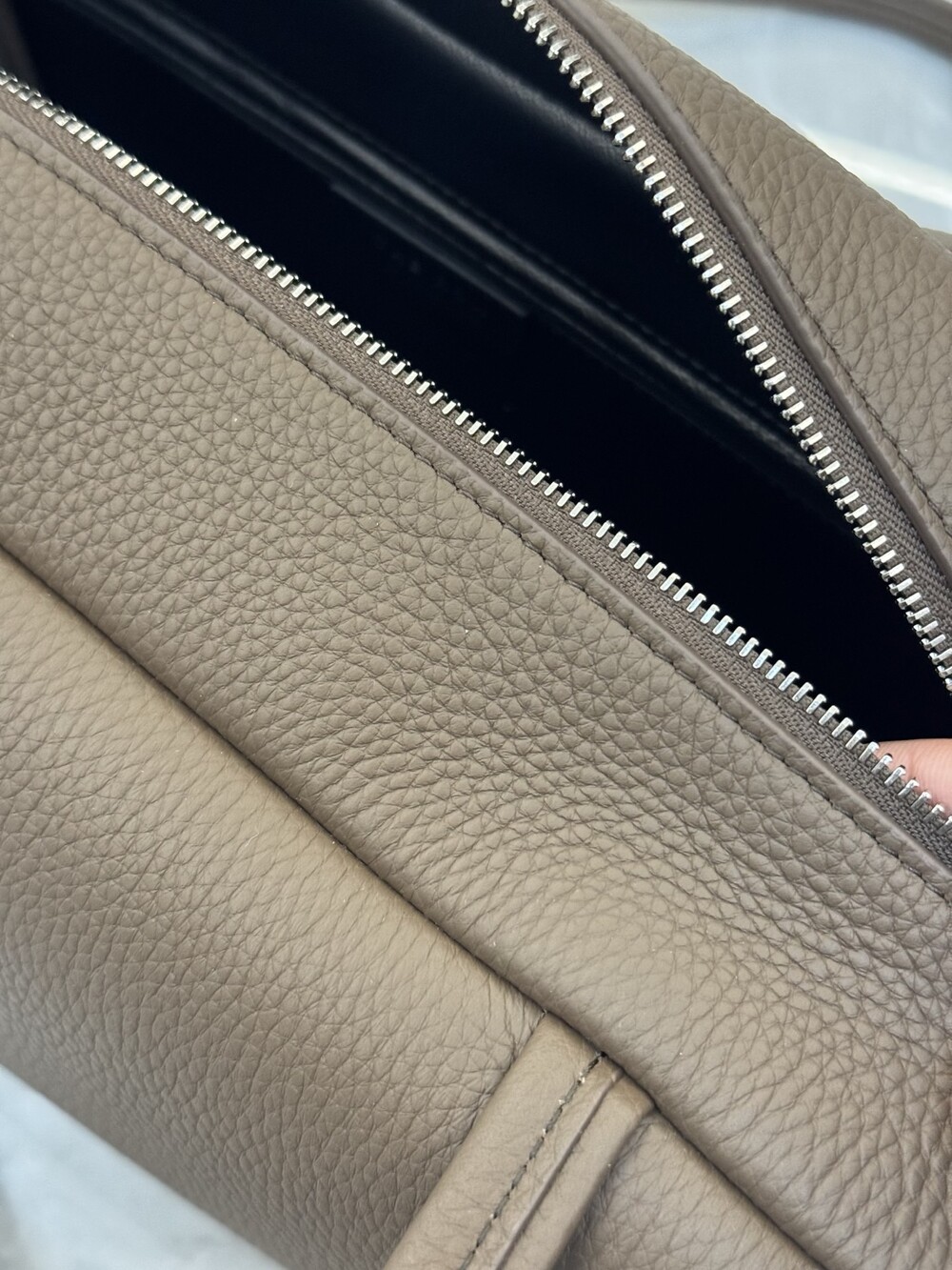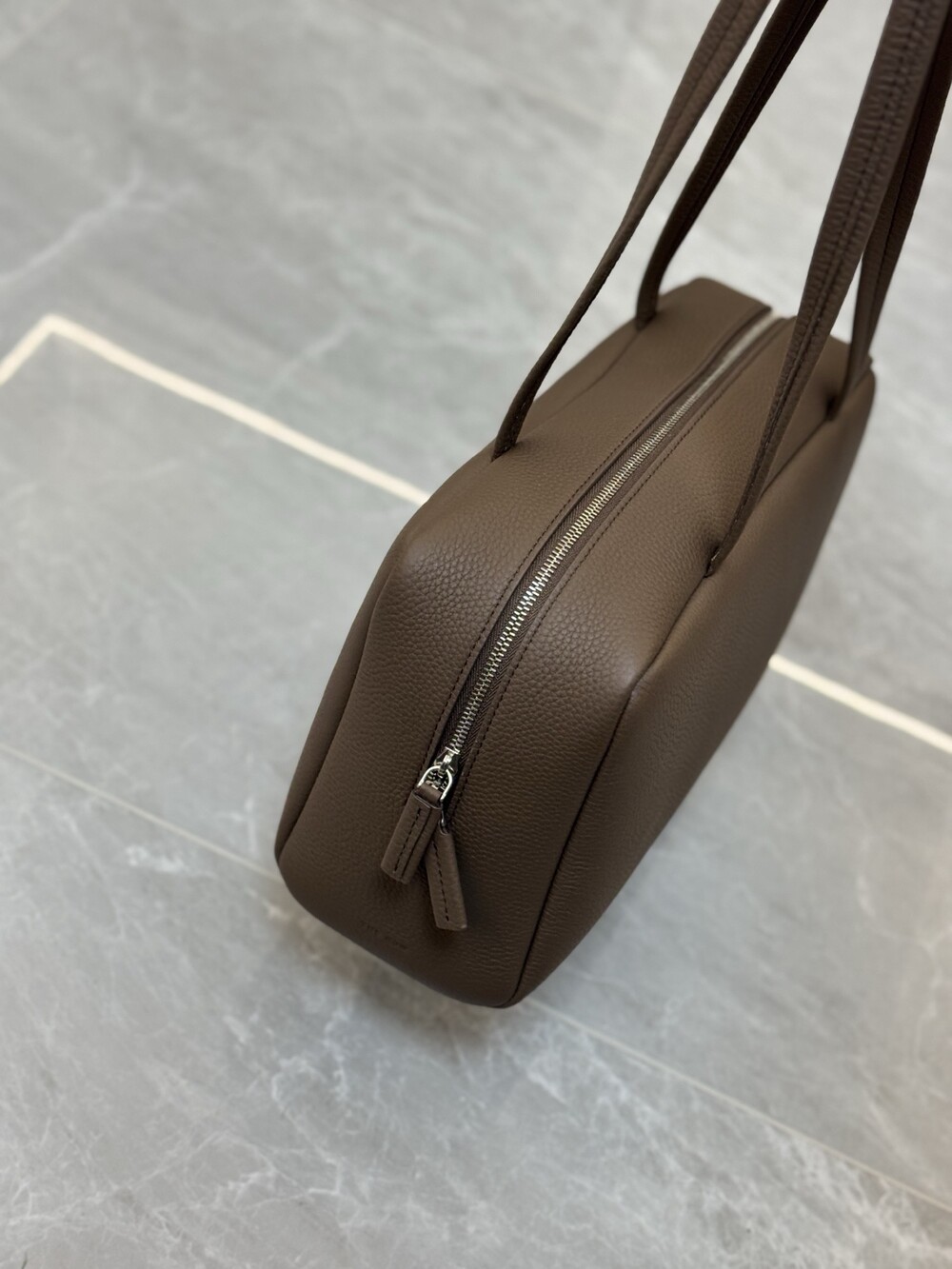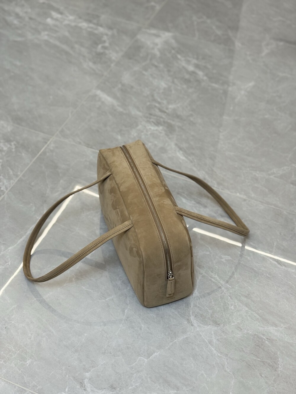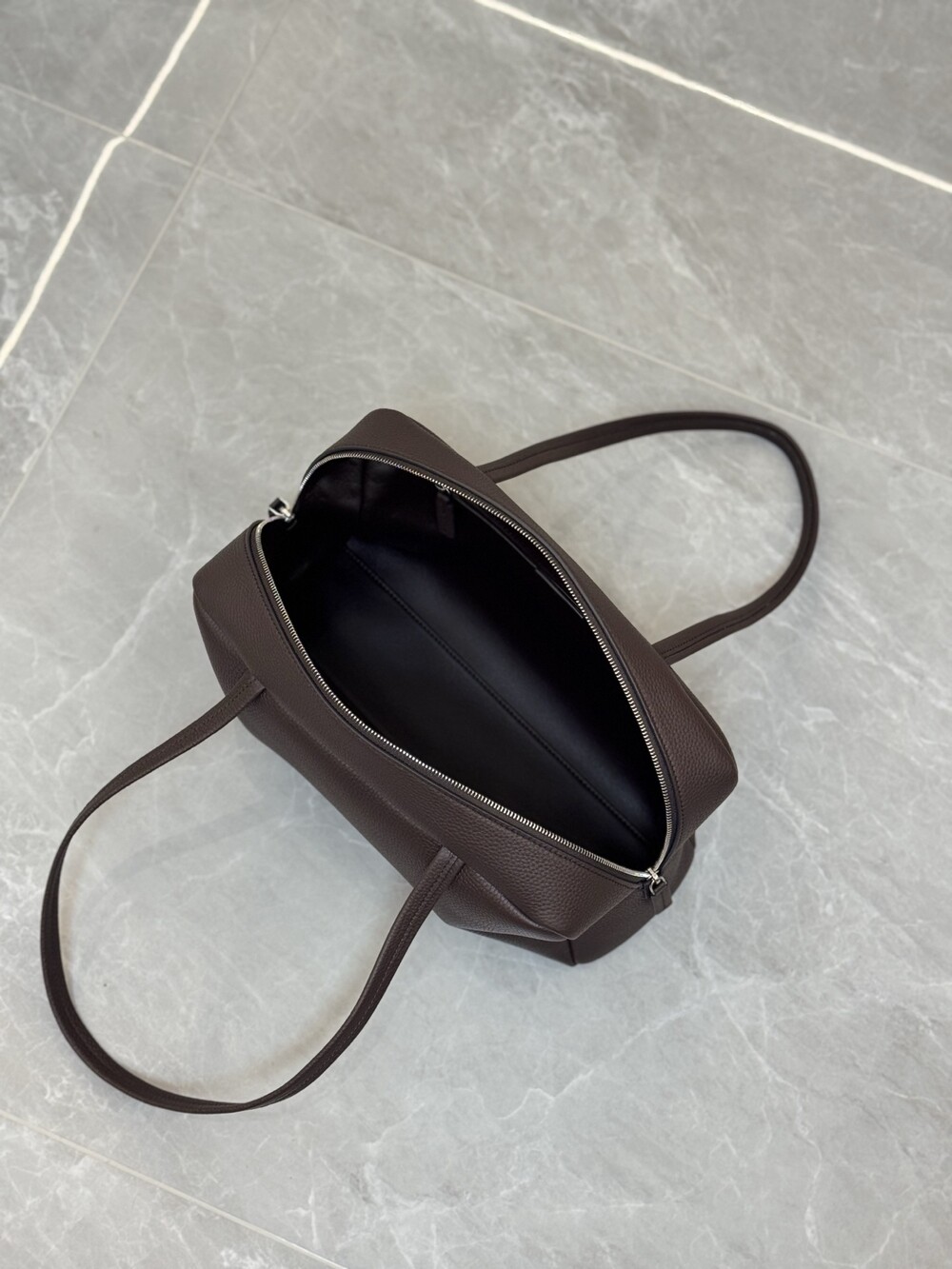 둥근 가장자리 구조, 긴 플랫 핸들과 듀얼 지퍼 클로저가 특징인 부드러운 가죽 소재의 소프트 볼링 백. 자연스러운 그레인의 표면을 가볍게 닦아내 세련된 스웨이드 느낌을 연출했습니다.