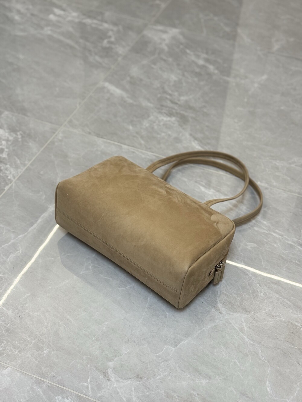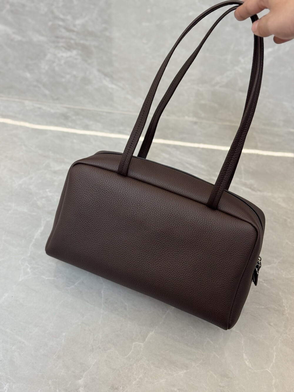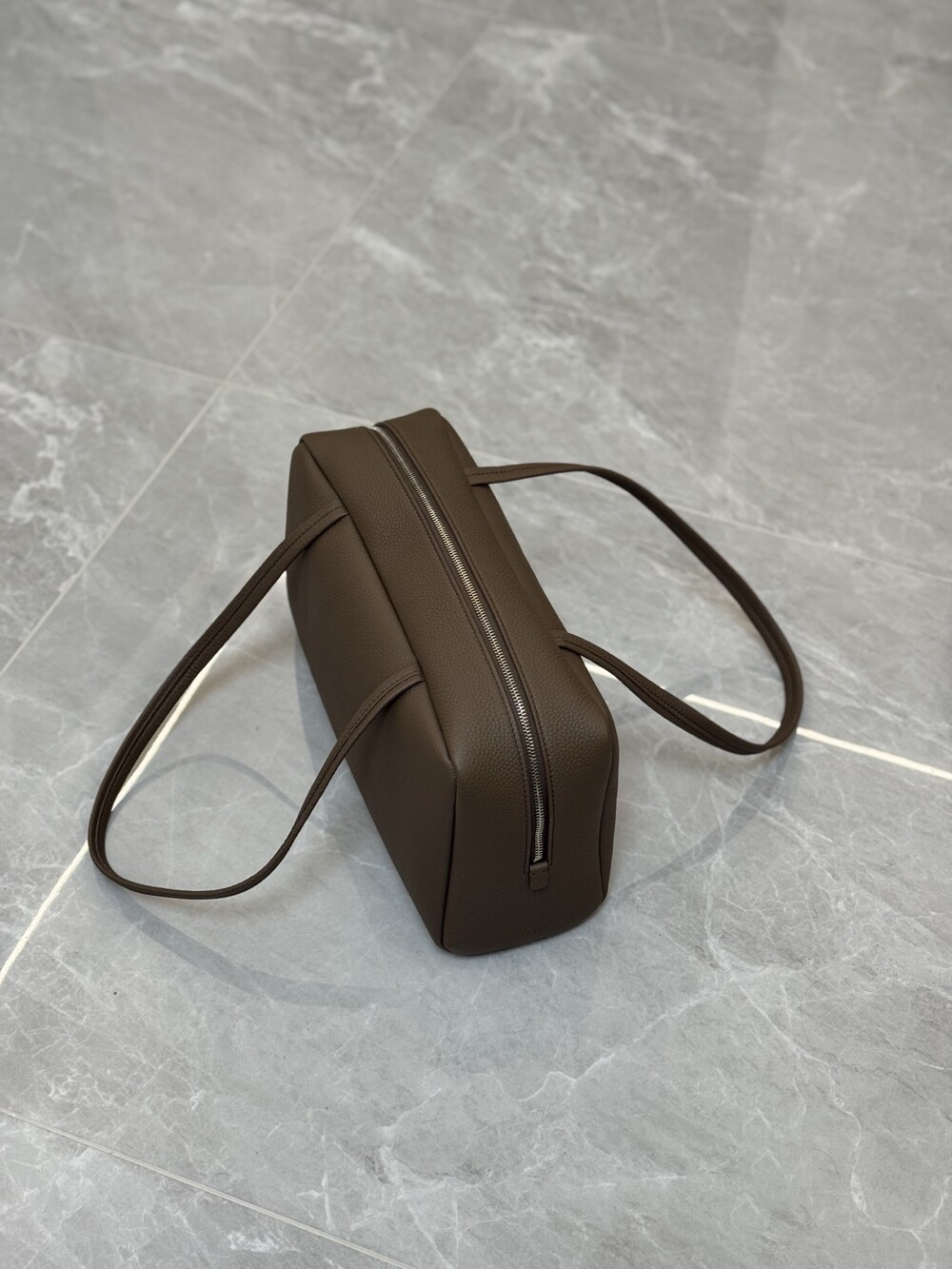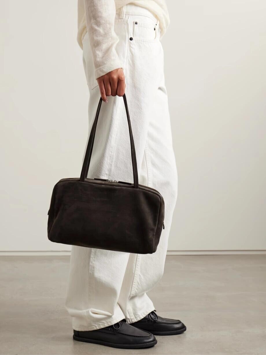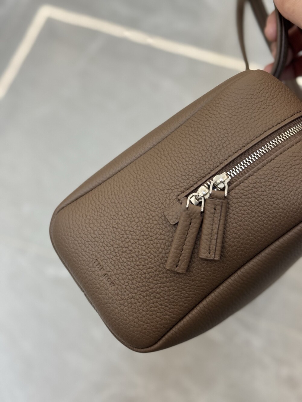 둥근 가장자리 구조, 긴 플랫 핸들과 듀얼 지퍼 클로저가 특징인 부드러운 가죽 소재의 소프트 볼링 백. 자연스러운 그레인의 표면을 가볍게 닦아내 세련된 스웨이드 느낌을 연출했습니다.