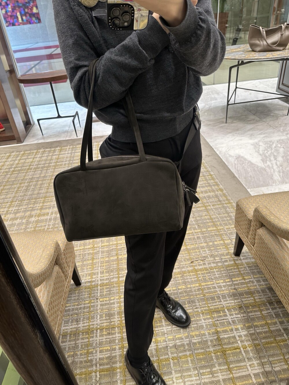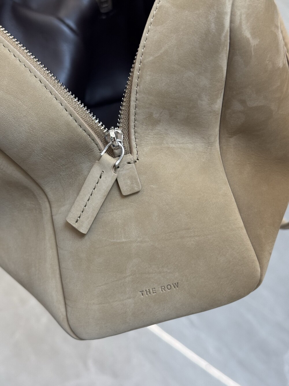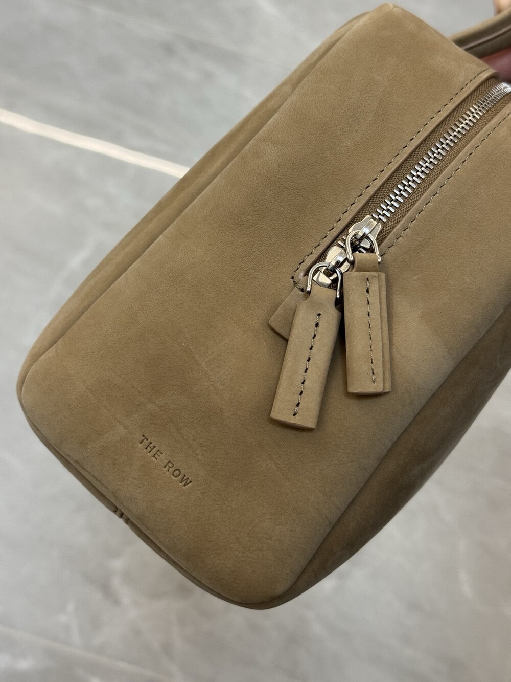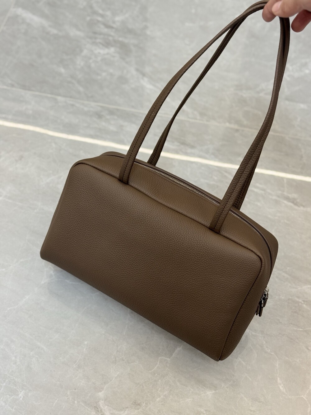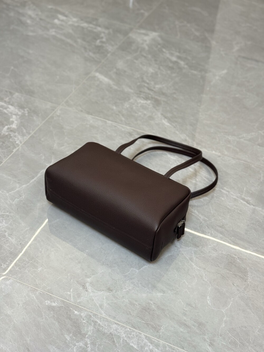 둥근 가장자리 구조, 긴 플랫 핸들과 듀얼 지퍼 클로저가 특징인 부드러운 가죽 소재의 소프트 볼링 백. 자연스러운 그레인의 표면을 가볍게 닦아내 세련된 스웨이드 느낌을 연출했습니다.