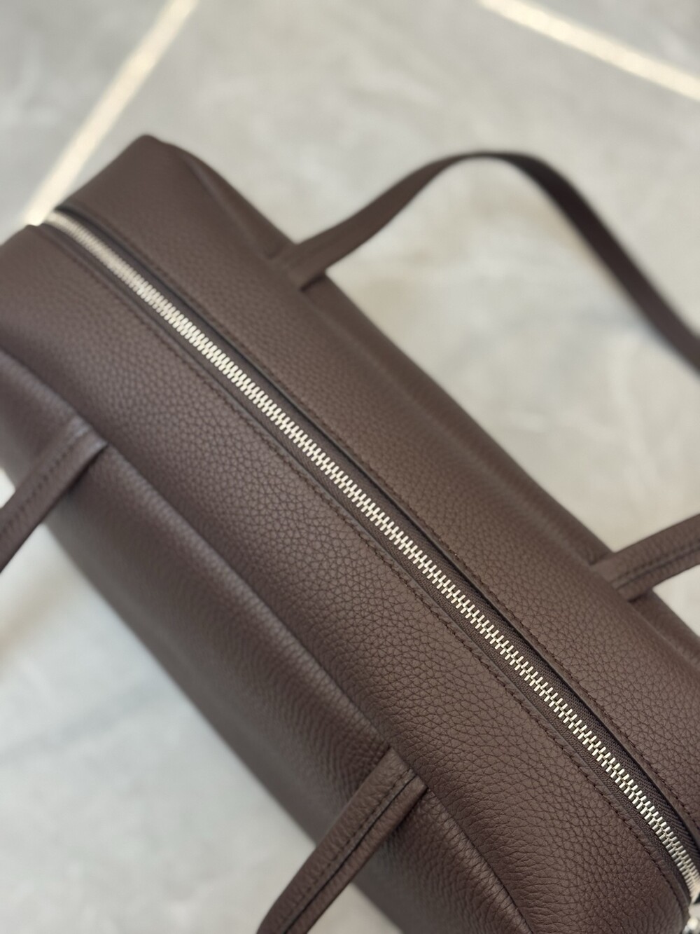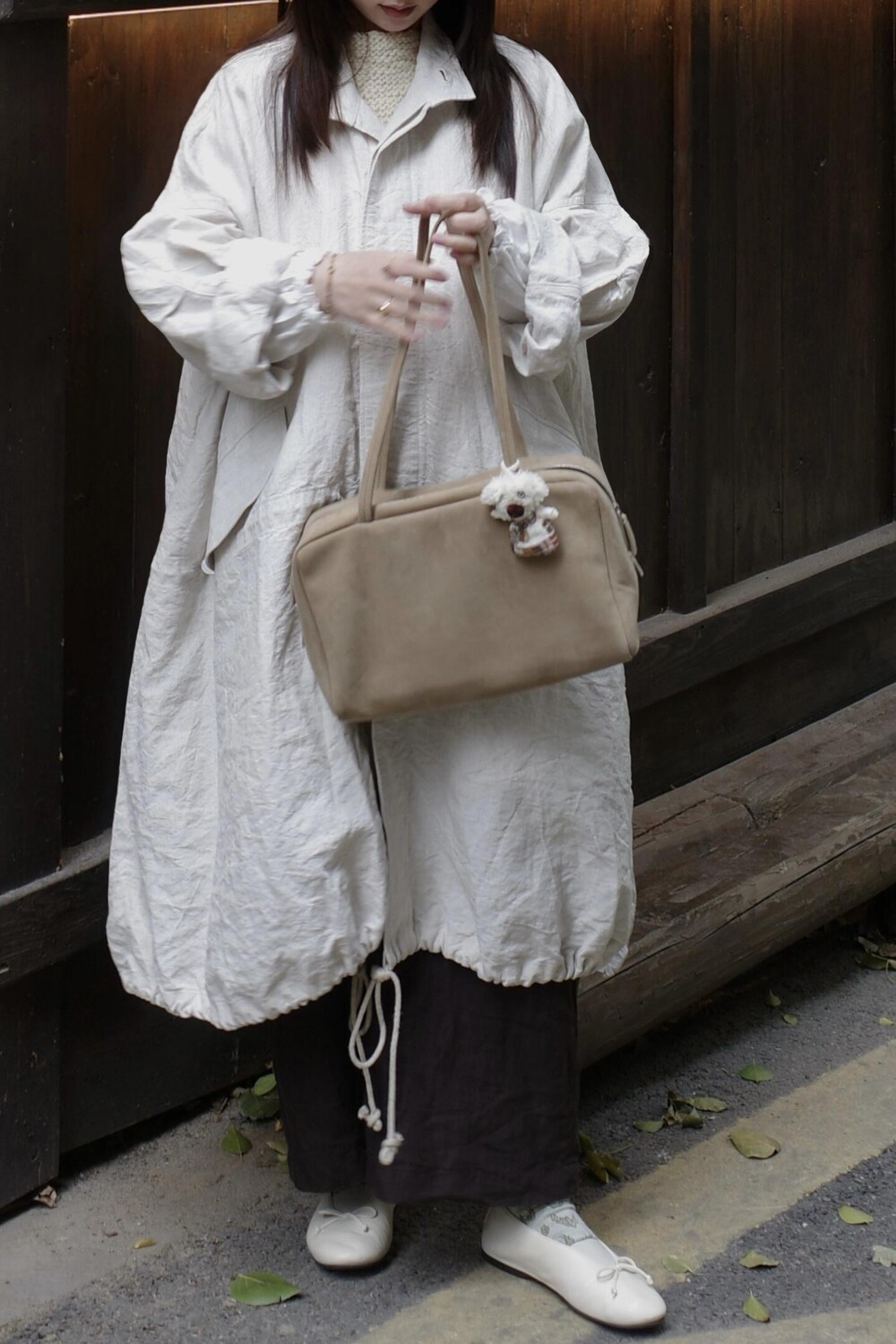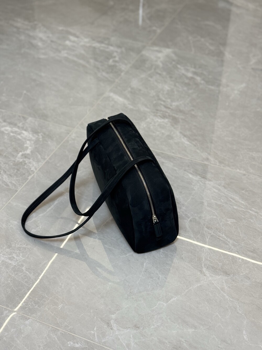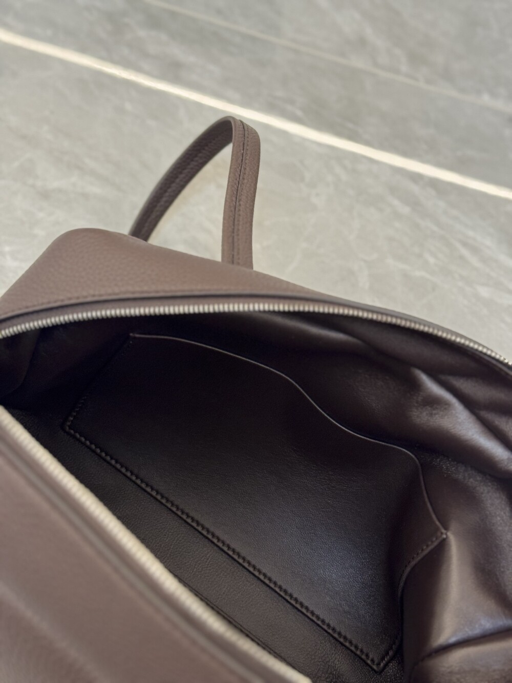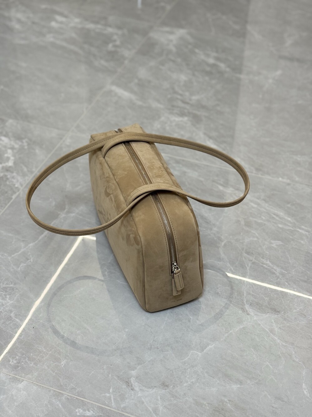 둥근 가장자리 구조, 긴 플랫 핸들과 듀얼 지퍼 클로저가 특징인 부드러운 가죽 소재의 소프트 볼링 백. 자연스러운 그레인의 표면을 가볍게 닦아내 세련된 스웨이드 느낌을 연출했습니다.