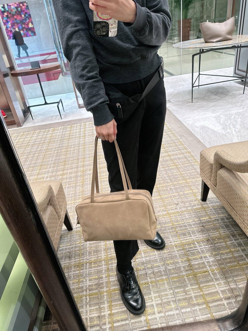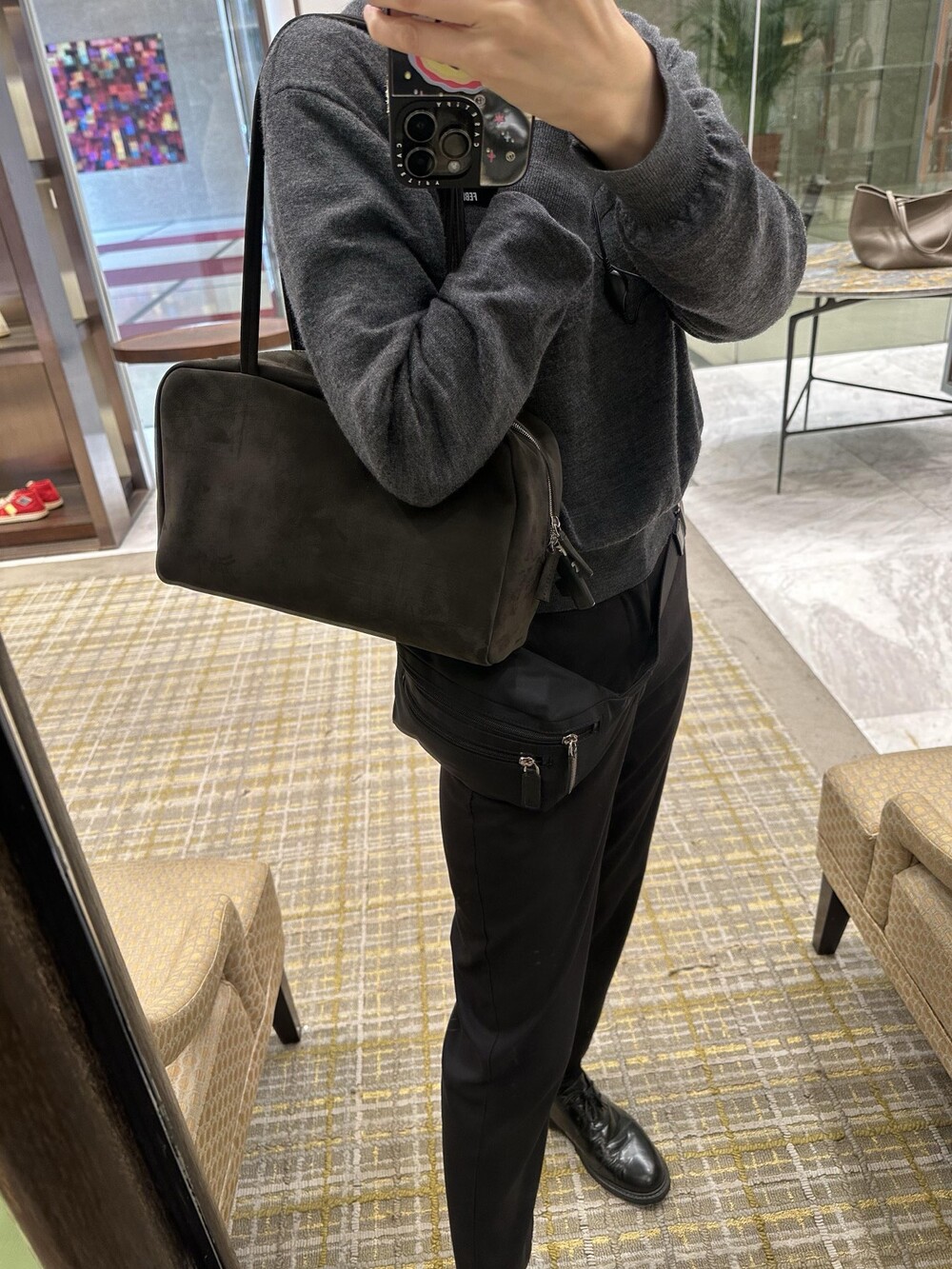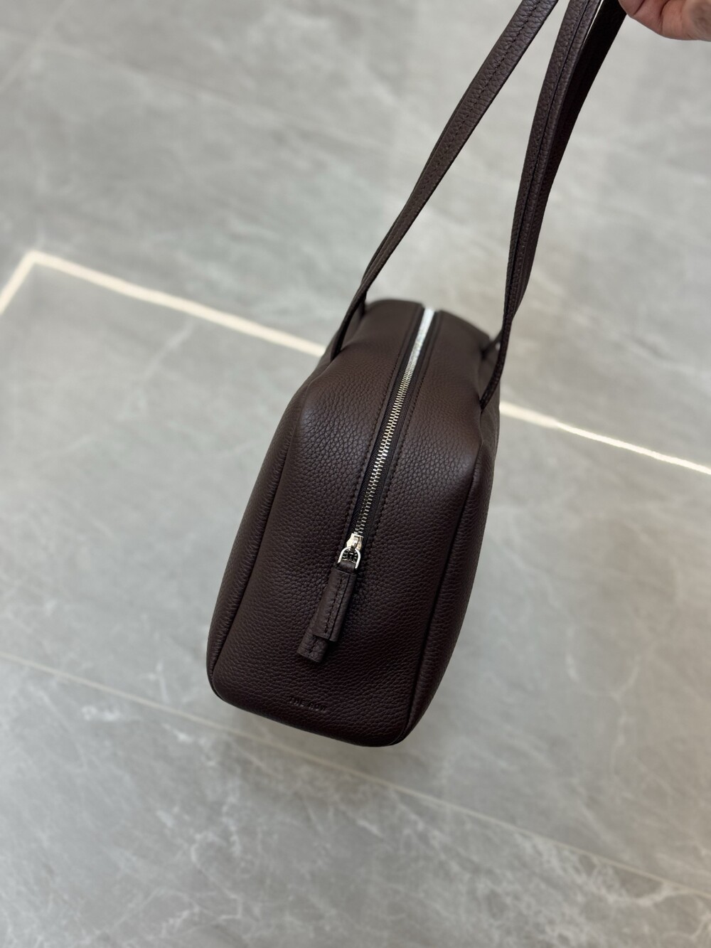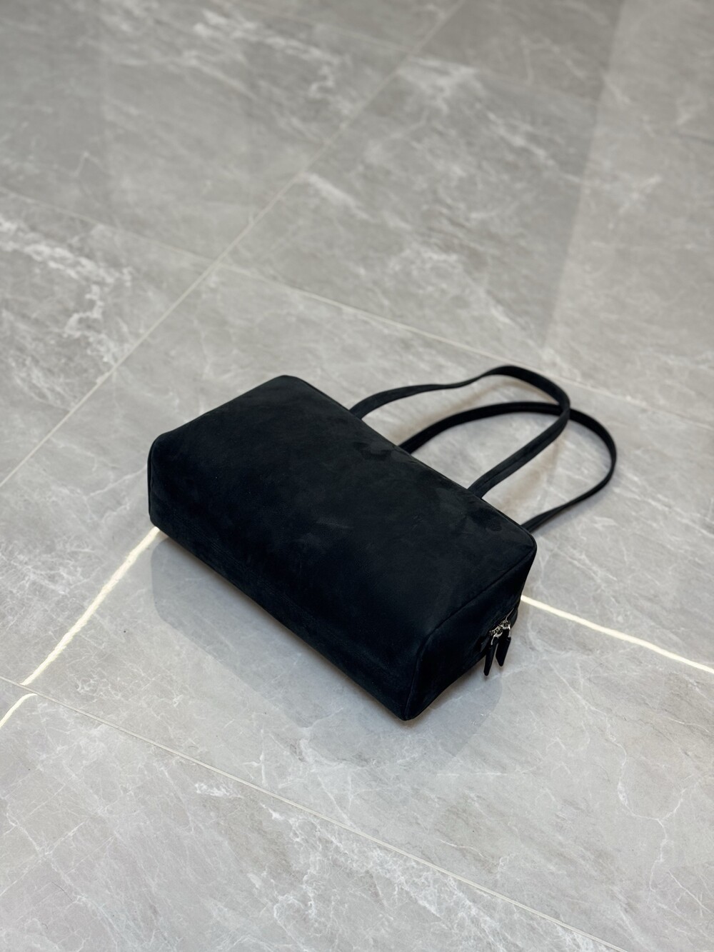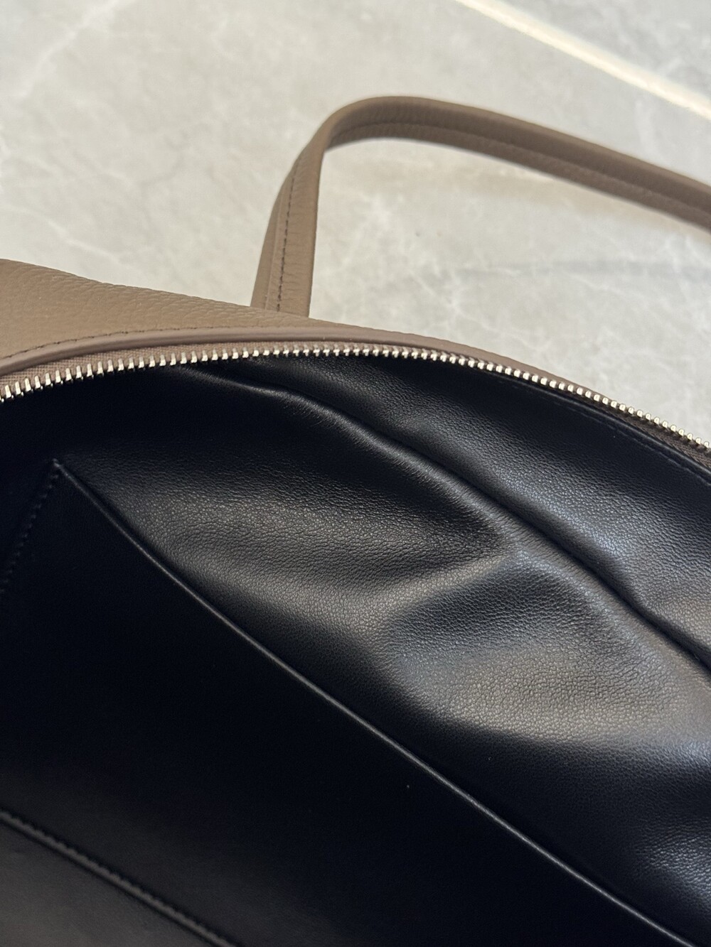 둥근 가장자리 구조, 긴 플랫 핸들과 듀얼 지퍼 클로저가 특징인 부드러운 가죽 소재의 소프트 볼링 백. 자연스러운 그레인의 표면을 가볍게 닦아내 세련된 스웨이드 느낌을 연출했습니다.