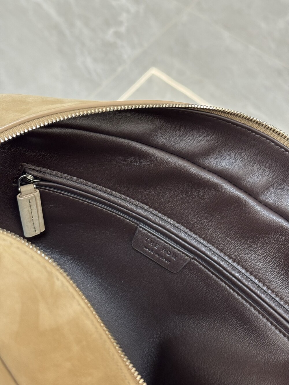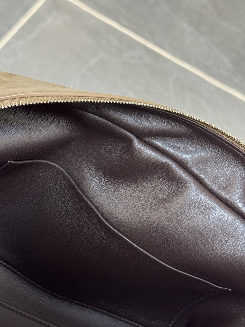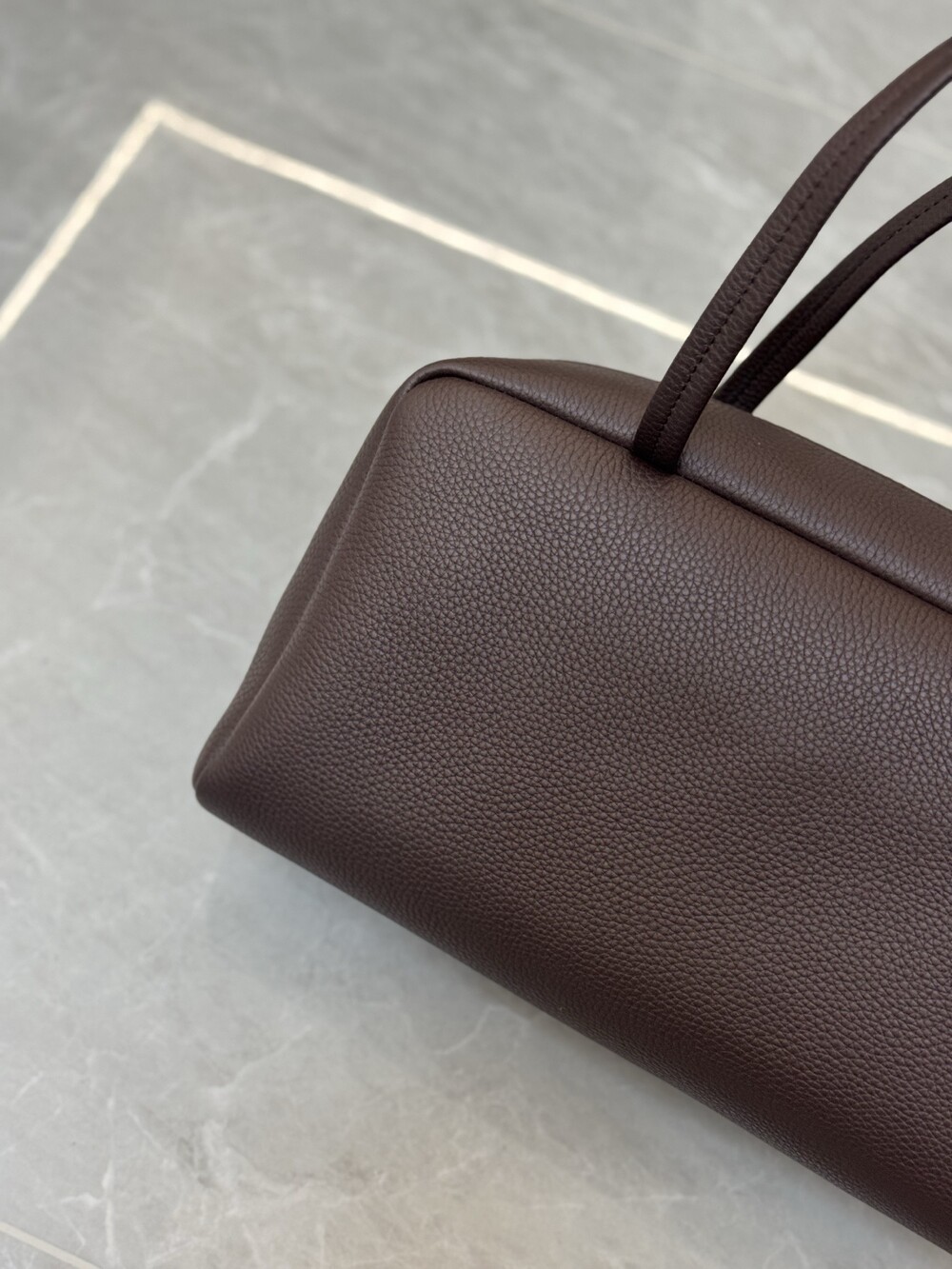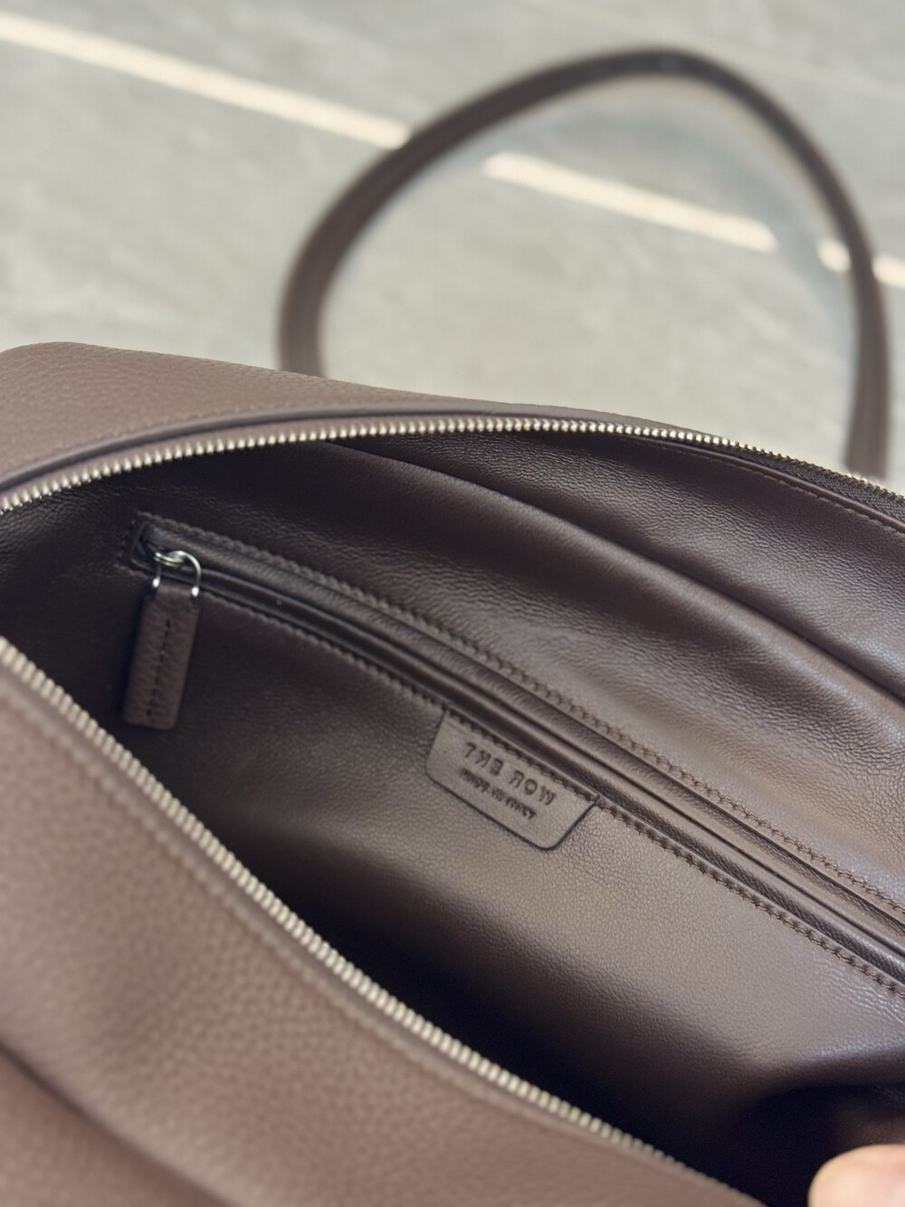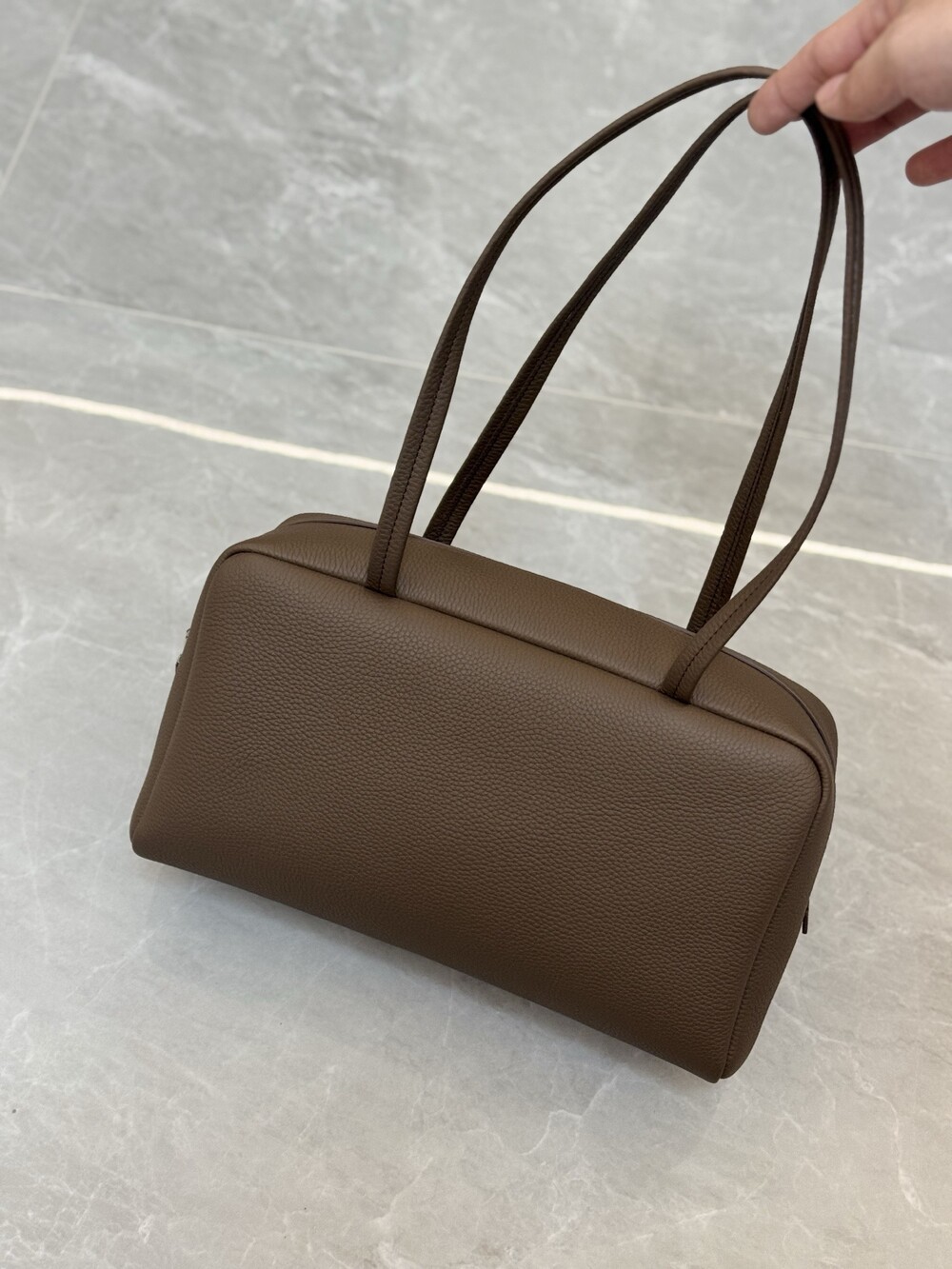 둥근 가장자리 구조, 긴 플랫 핸들과 듀얼 지퍼 클로저가 특징인 부드러운 가죽 소재의 소프트 볼링 백. 자연스러운 그레인의 표면을 가볍게 닦아내 세련된 스웨이드 느낌을 연출했습니다.