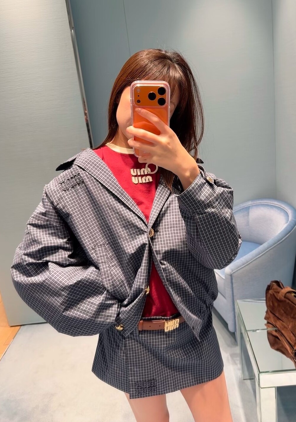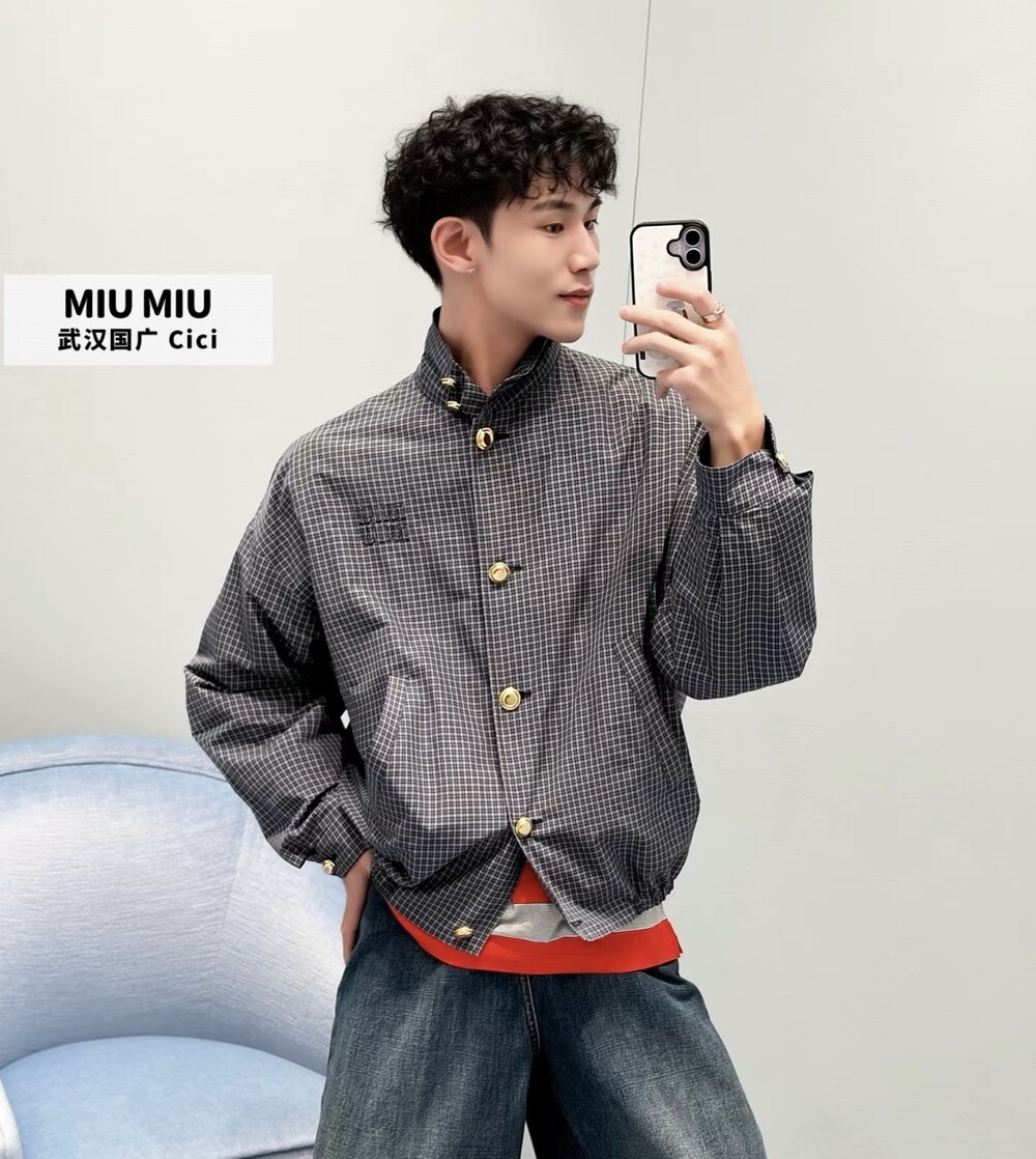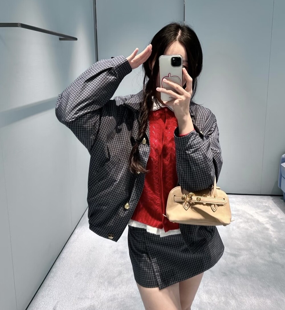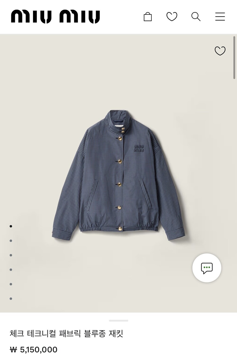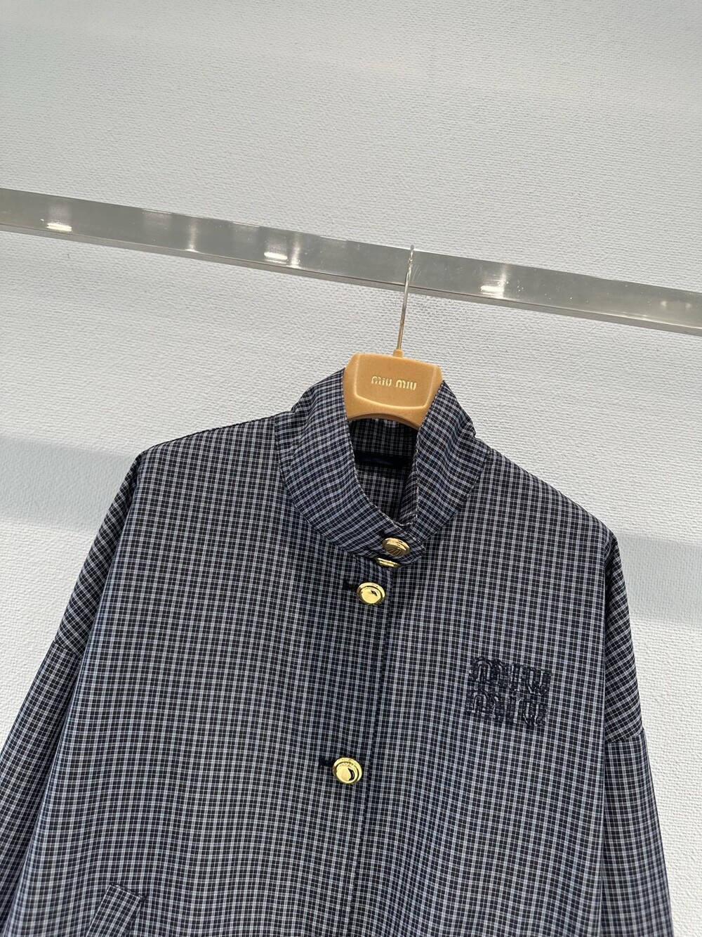 미우미우 체크 테크니컬 패브릭 블루종 재킷