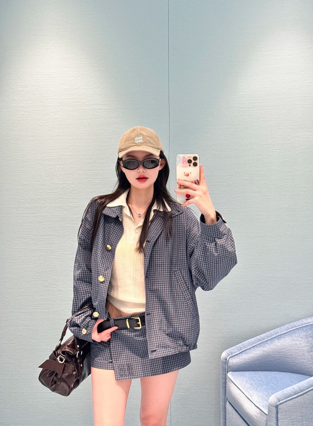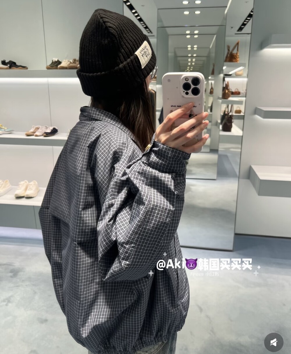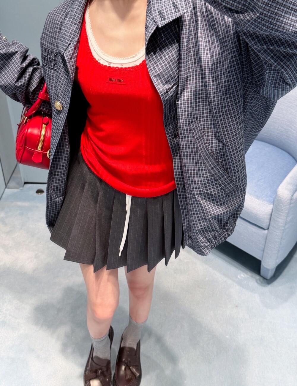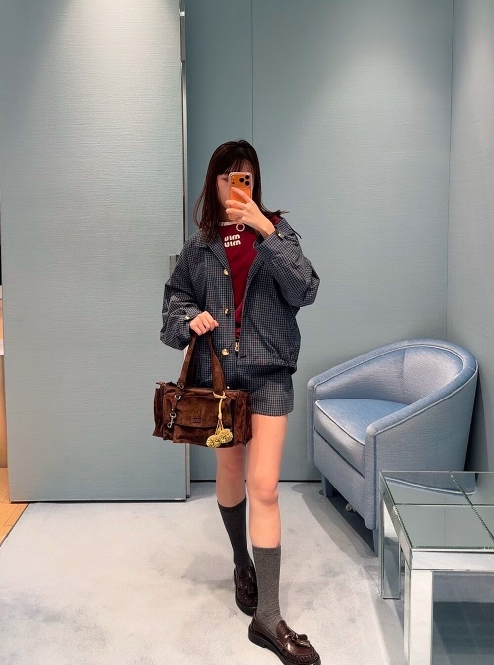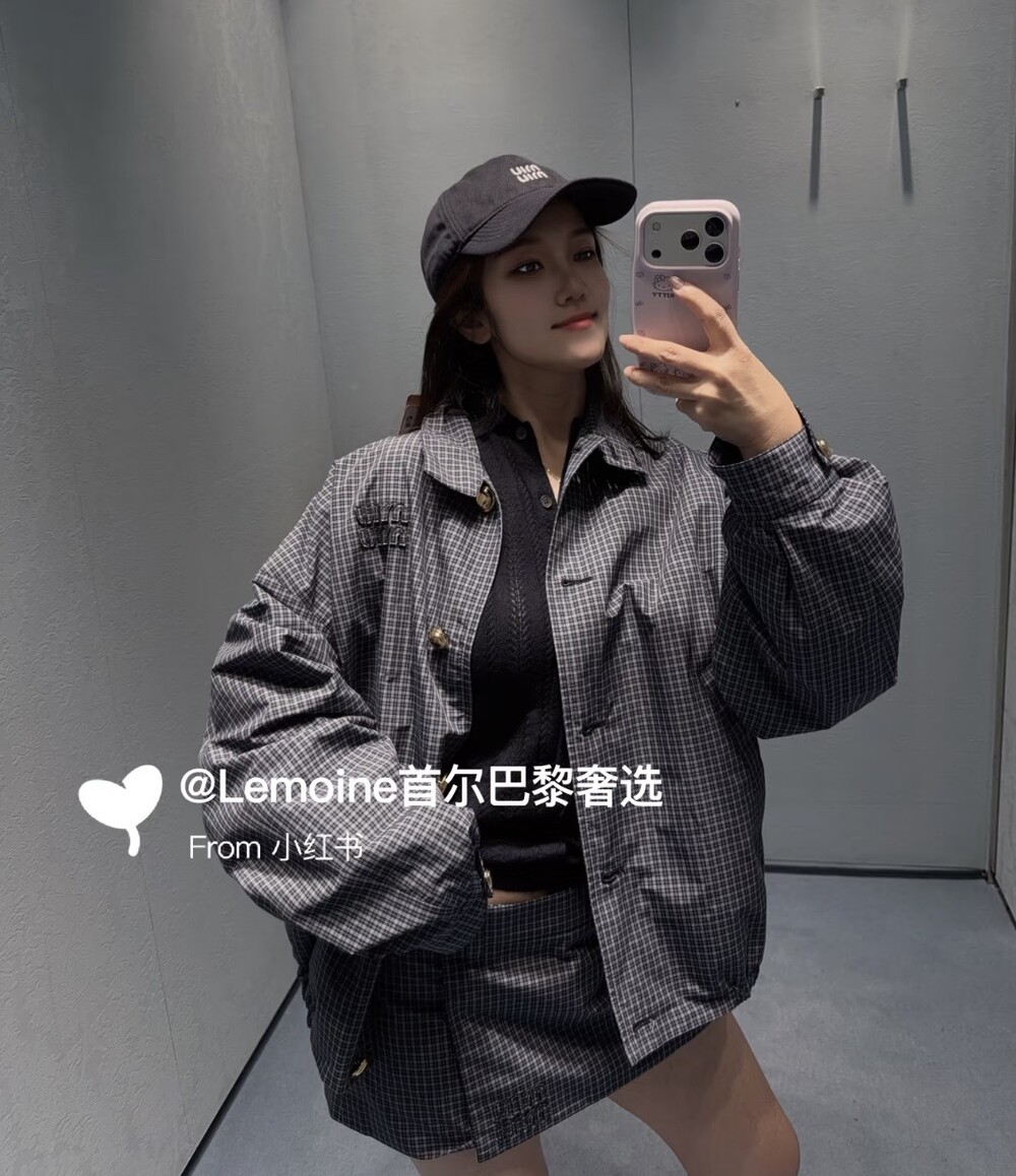 미우미우 체크 테크니컬 패브릭 블루종 재킷