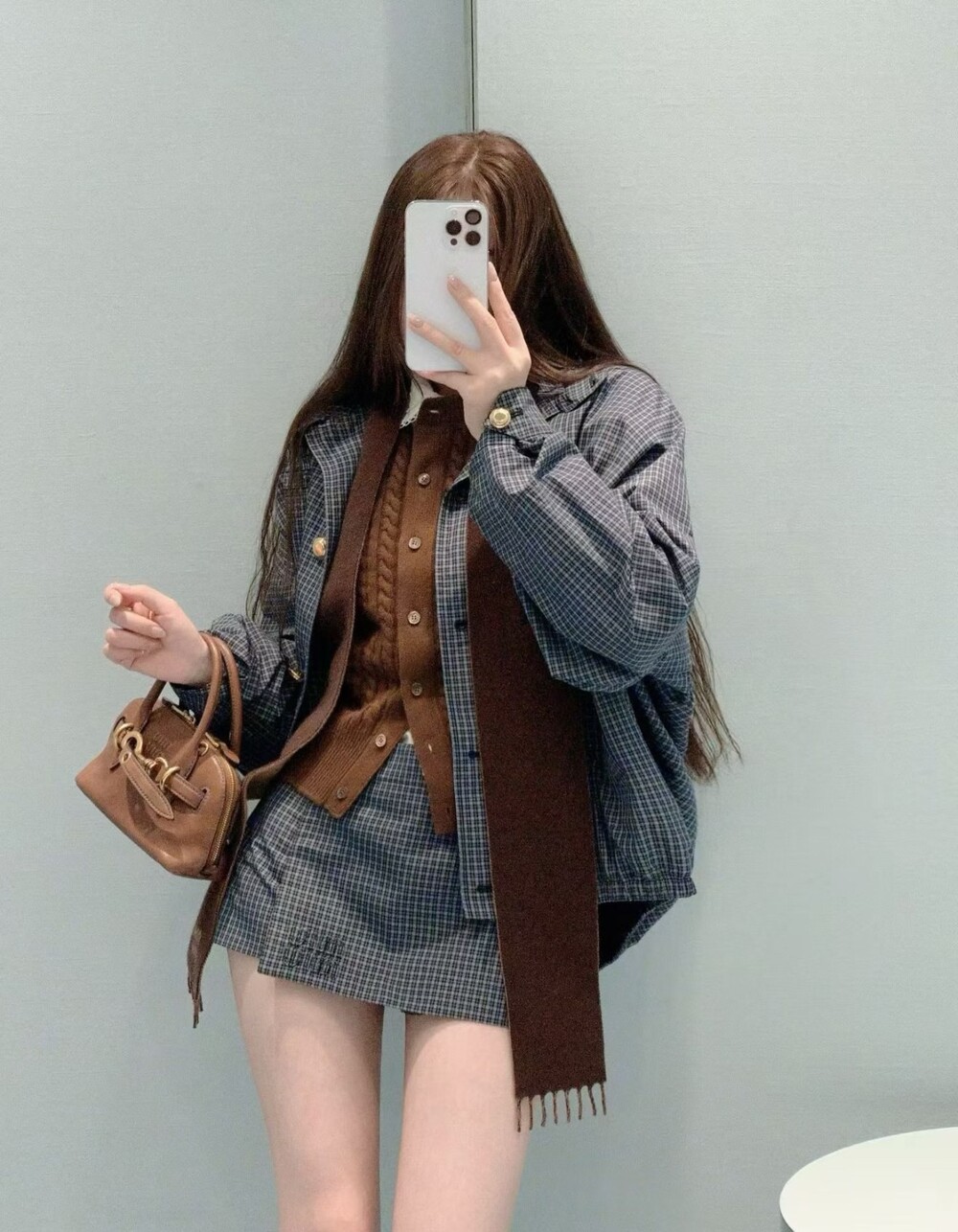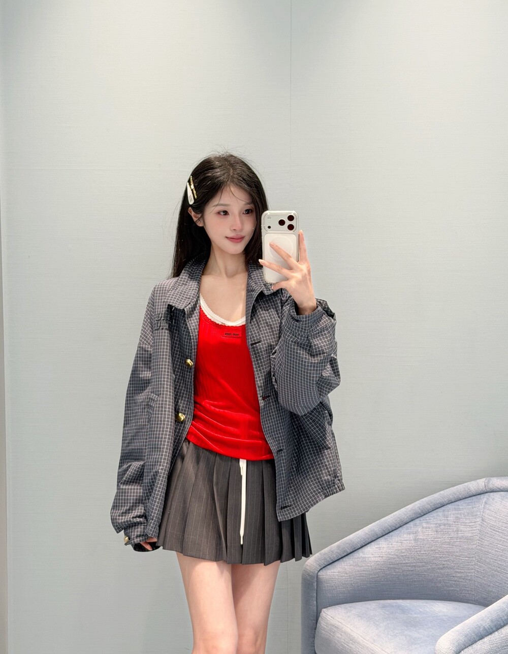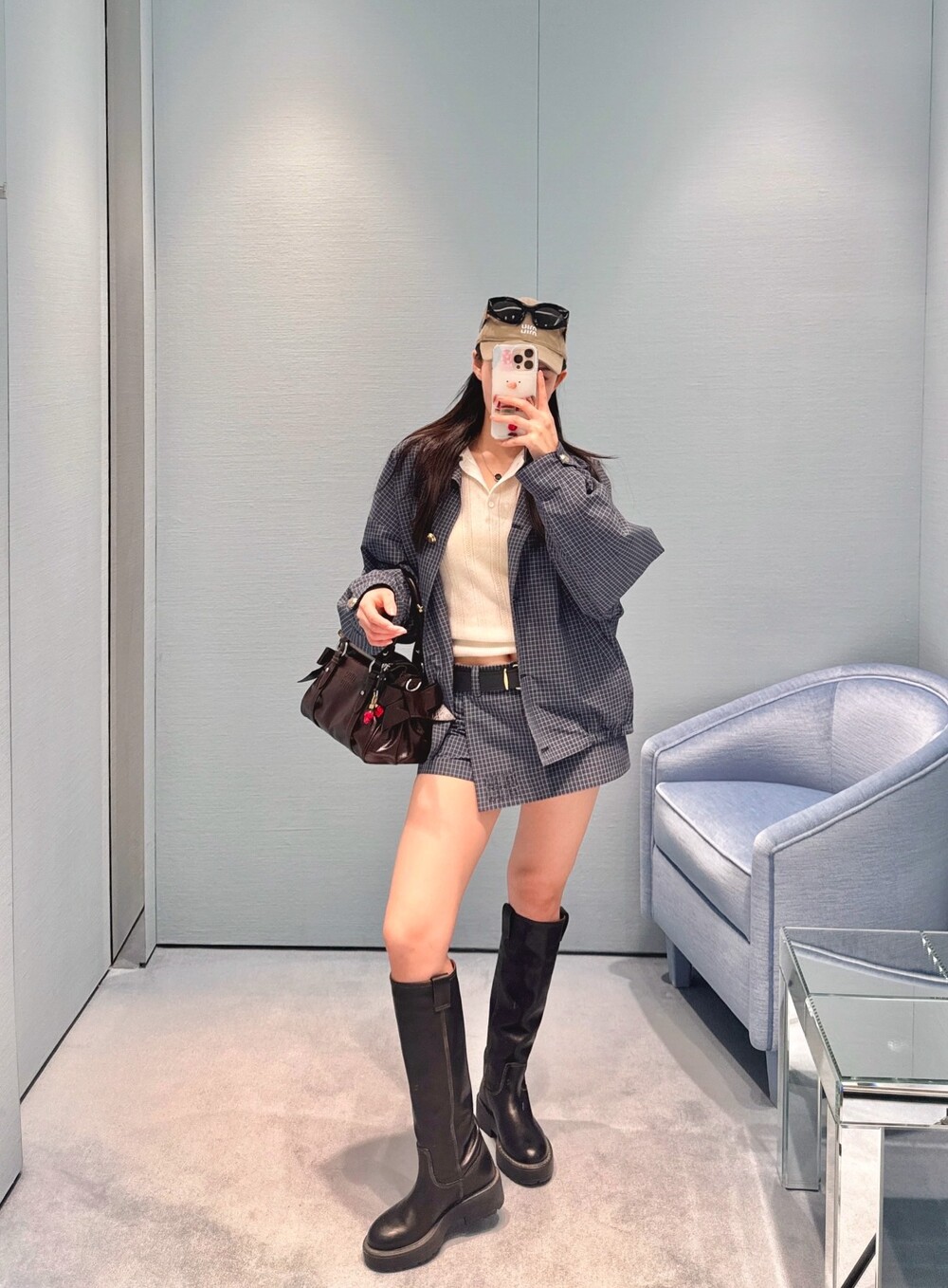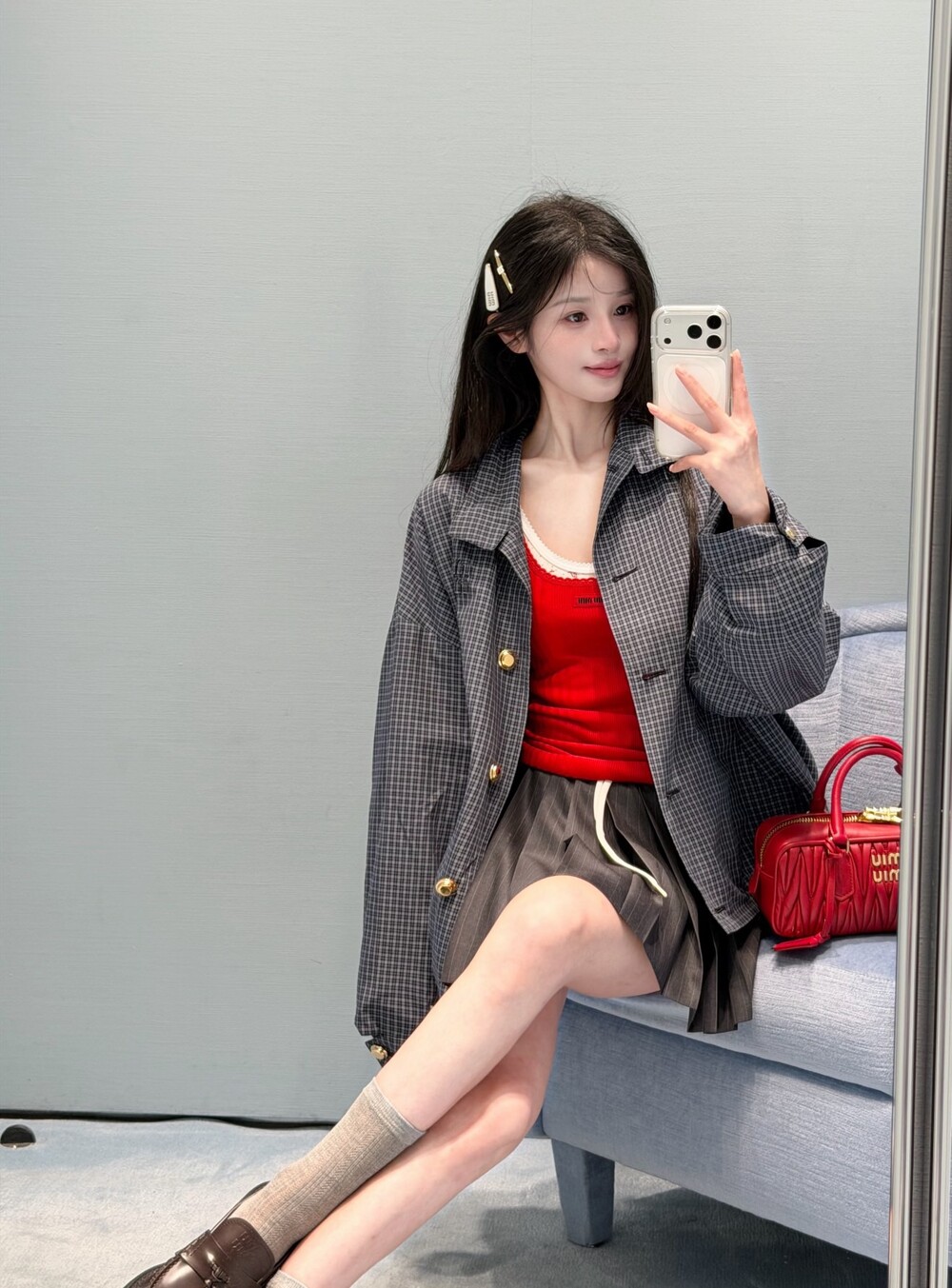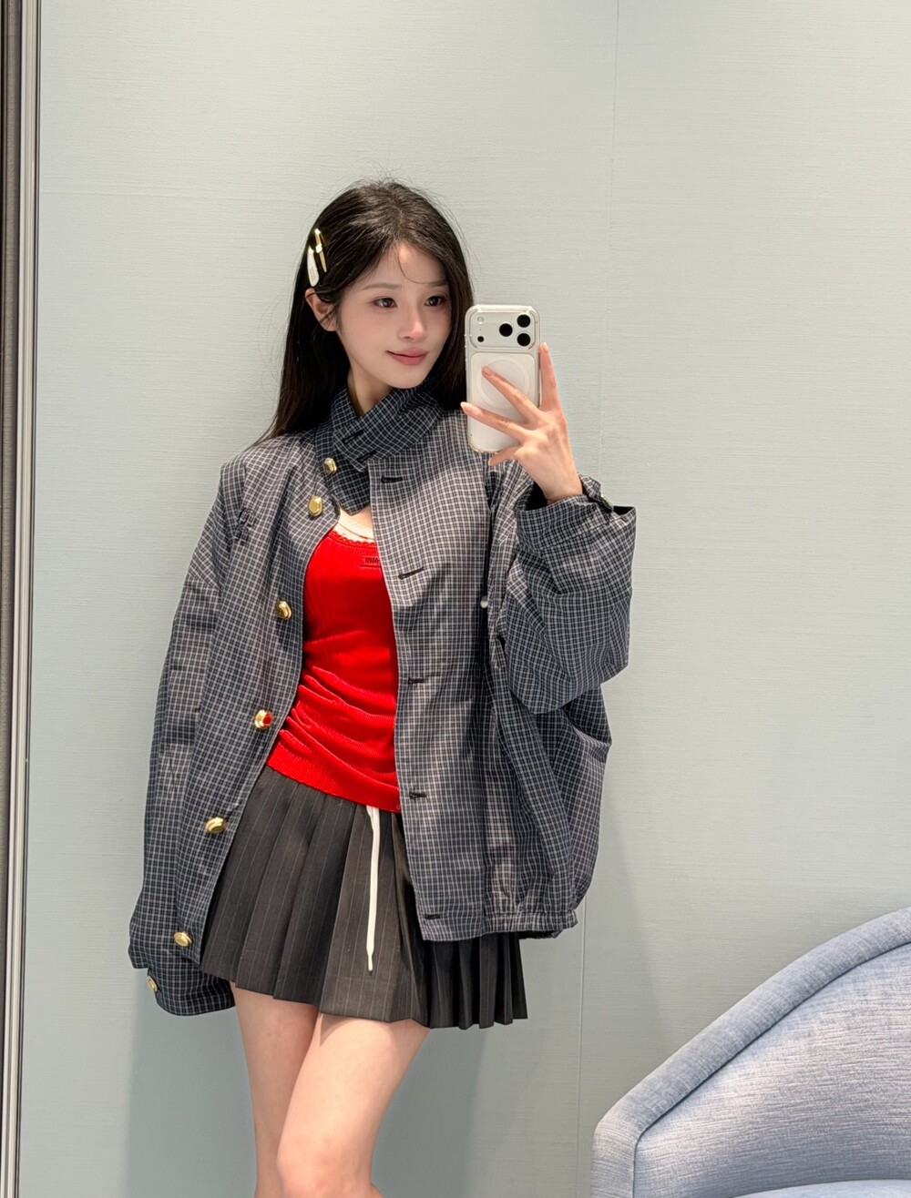 미우미우 체크 테크니컬 패브릭 블루종 재킷