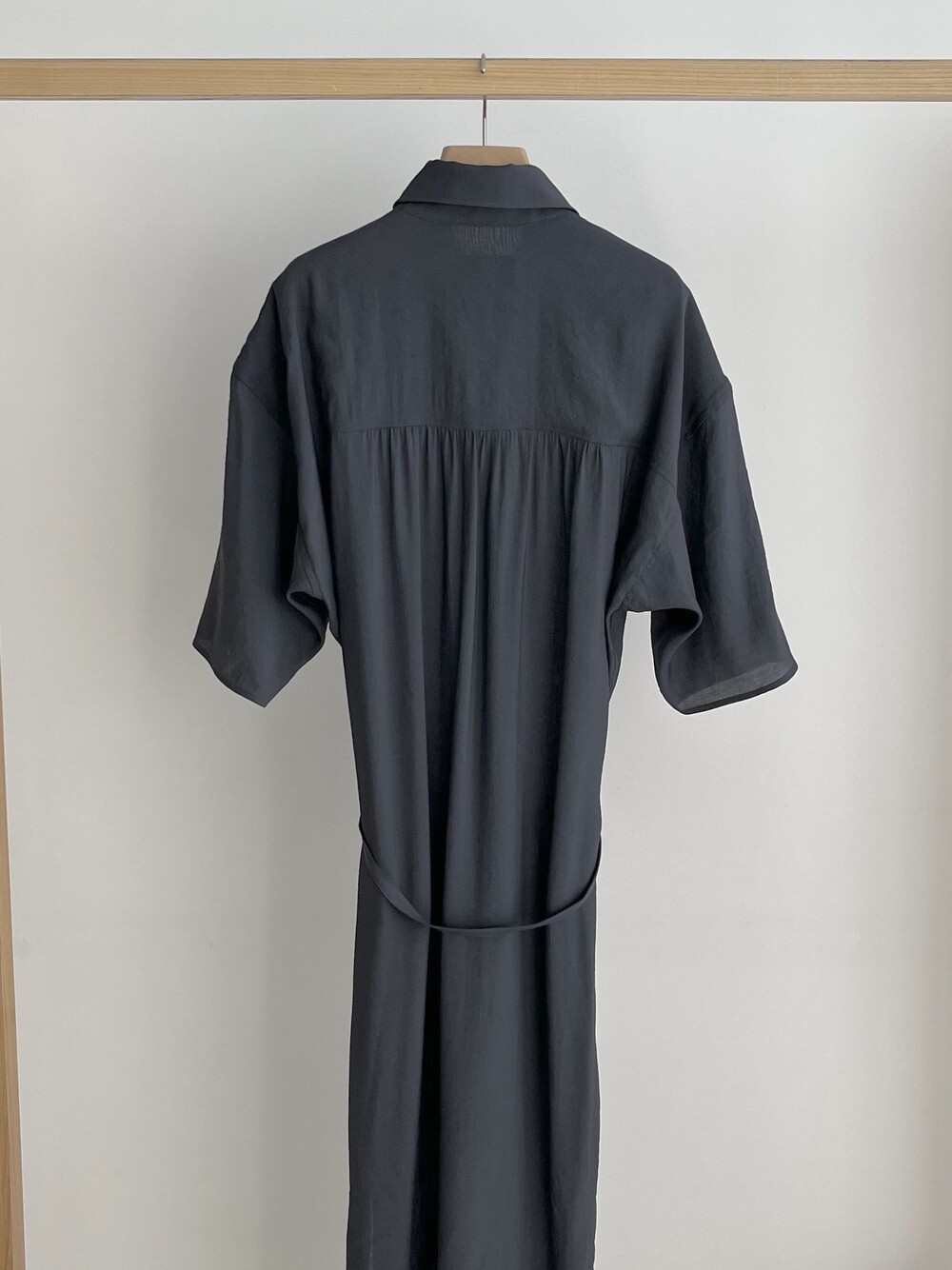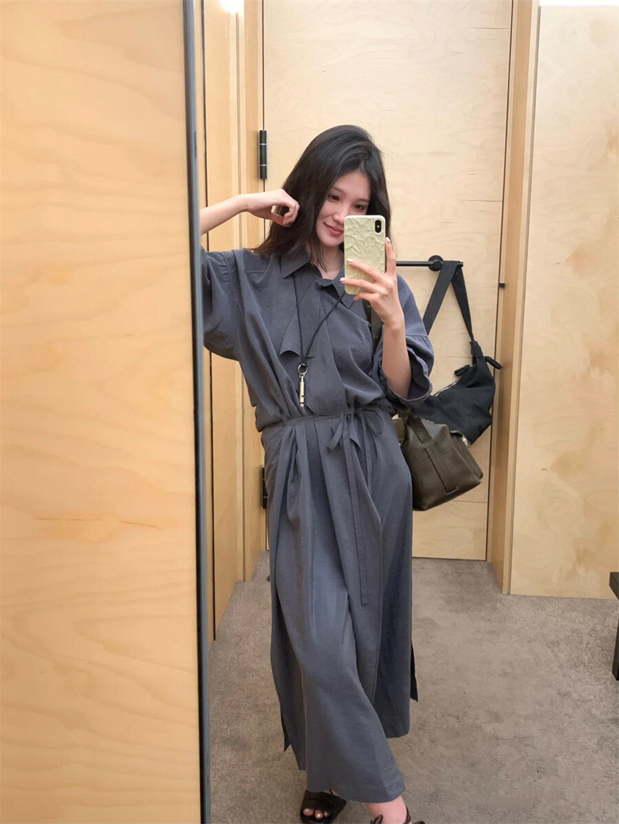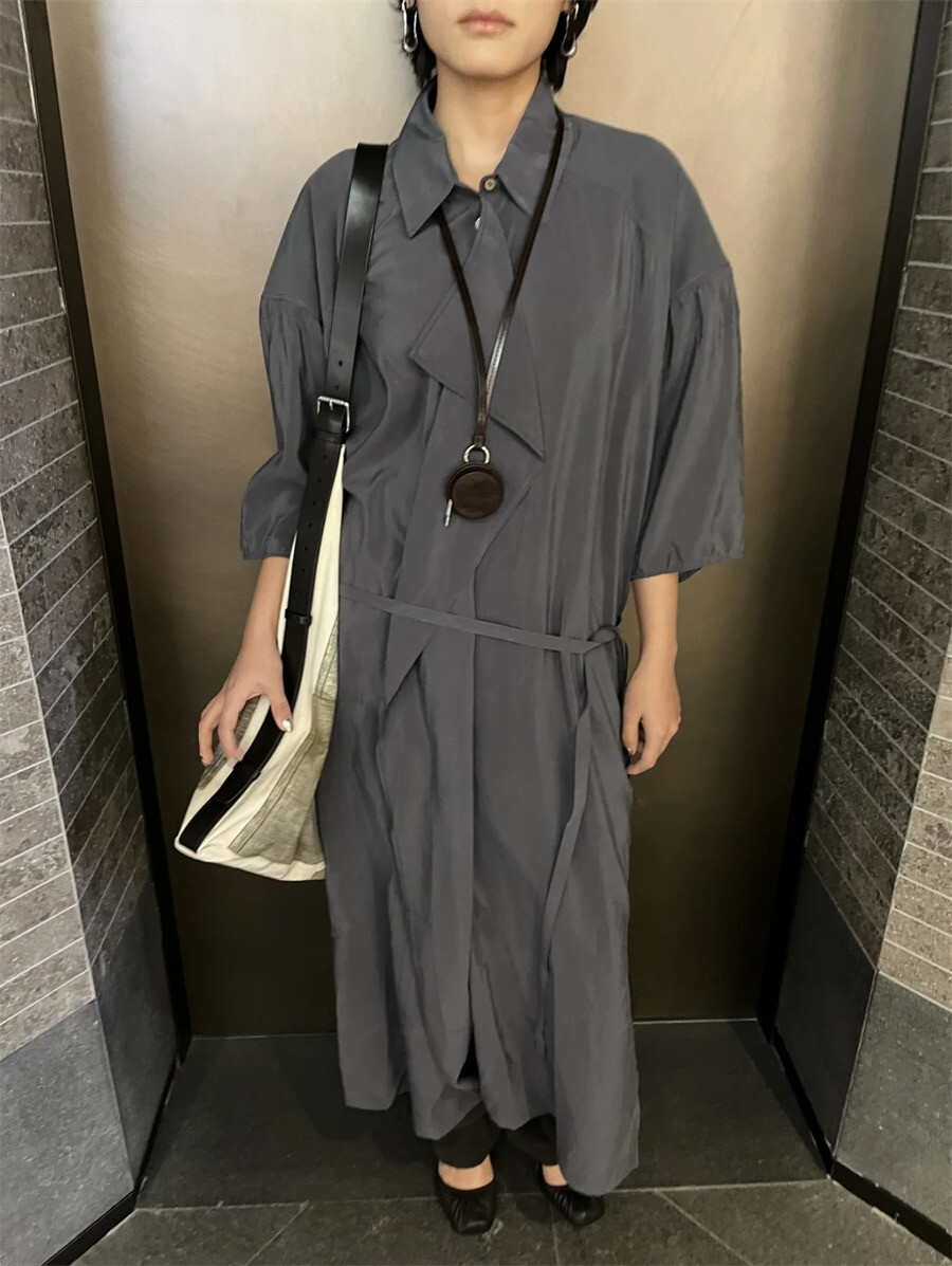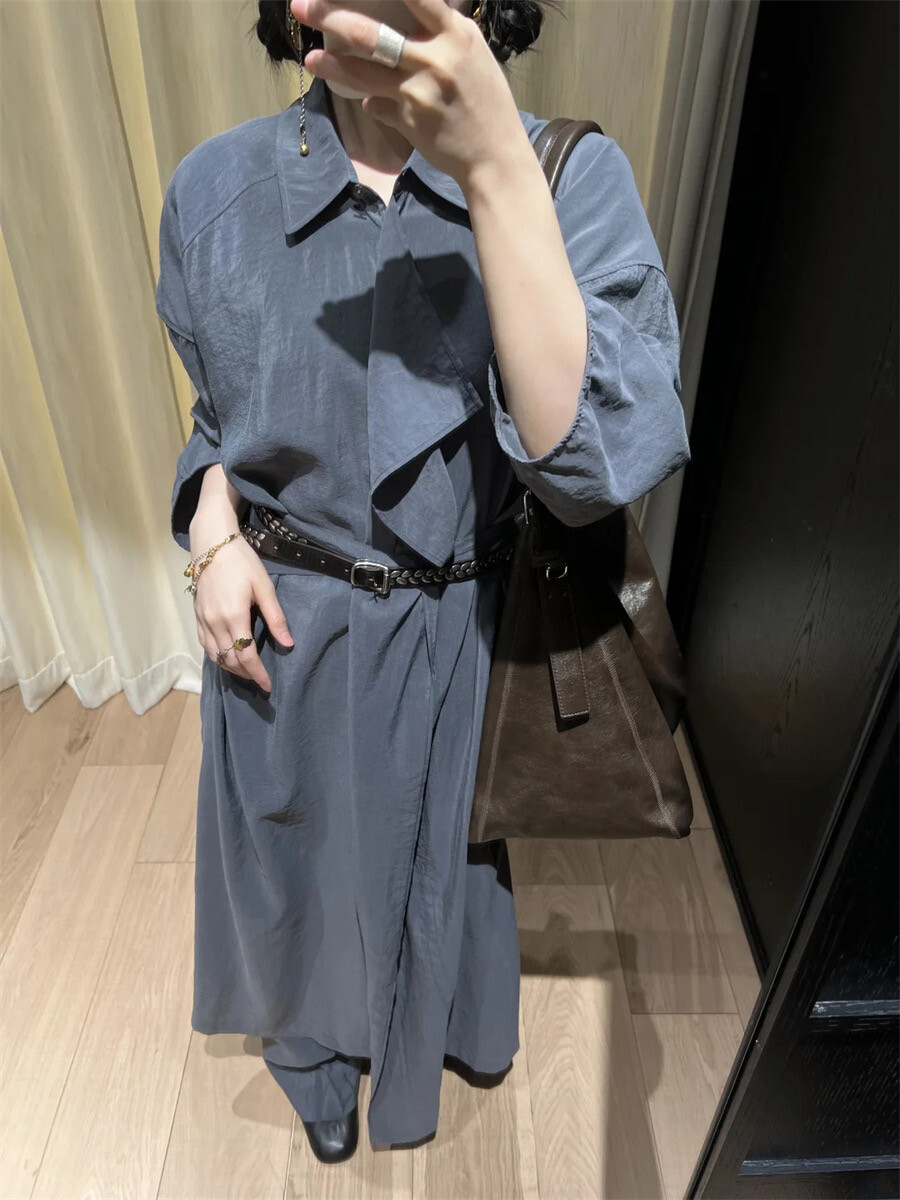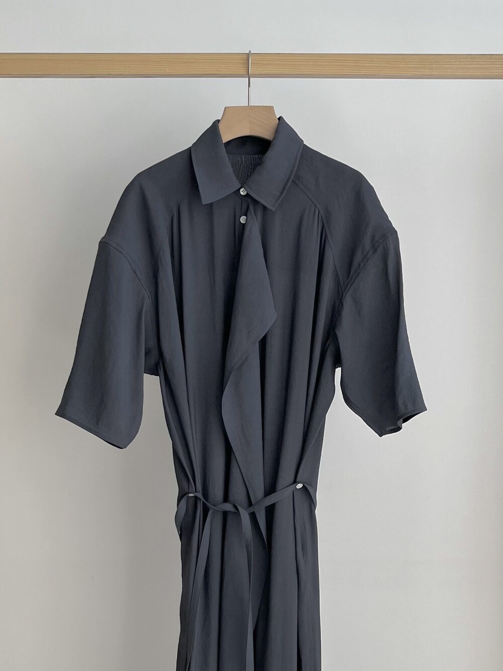 여유로운 실루엣과 넥 라인이 매력적인 셔츠 드레스입니다. 은은한 광택과 사선으로 흐르는 듯한 옷깃이 바쁜 도심 속 일상에 부드러운 여유를 더합니다. 허리의 끈 디테일을 활용해 다양한 실루엣으로 연출할 수 있습니다.