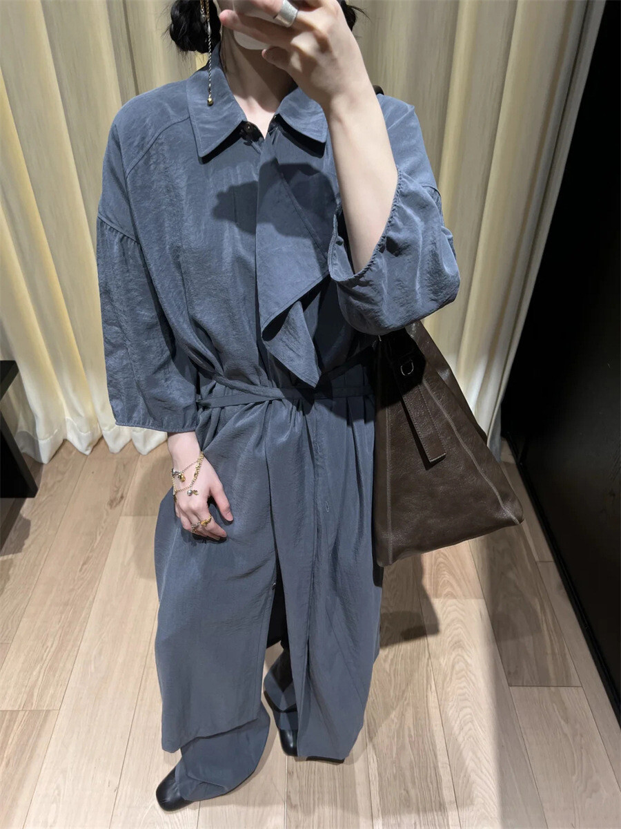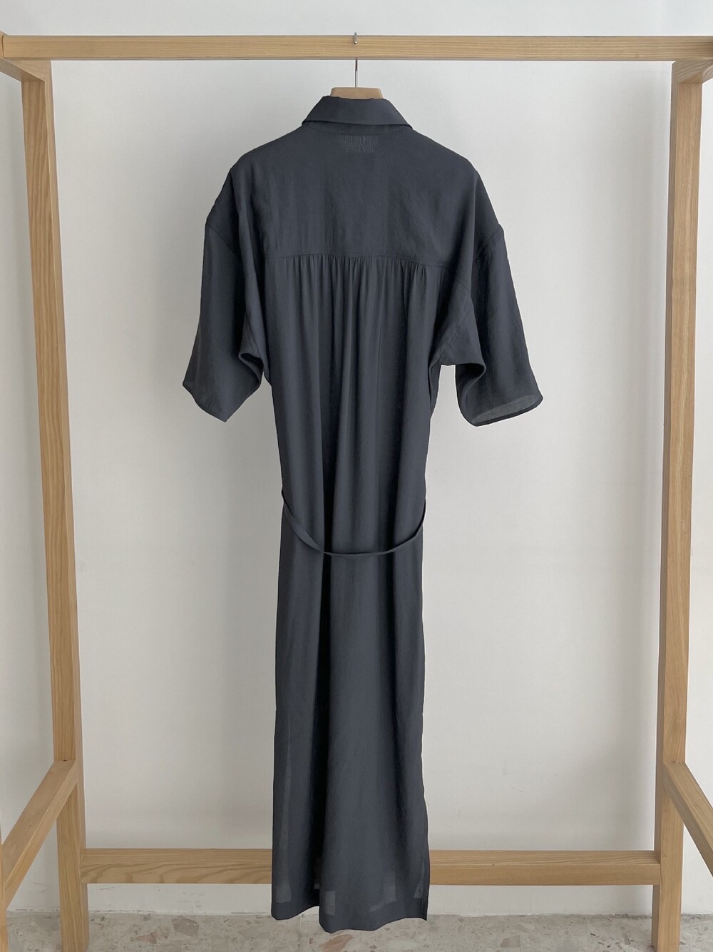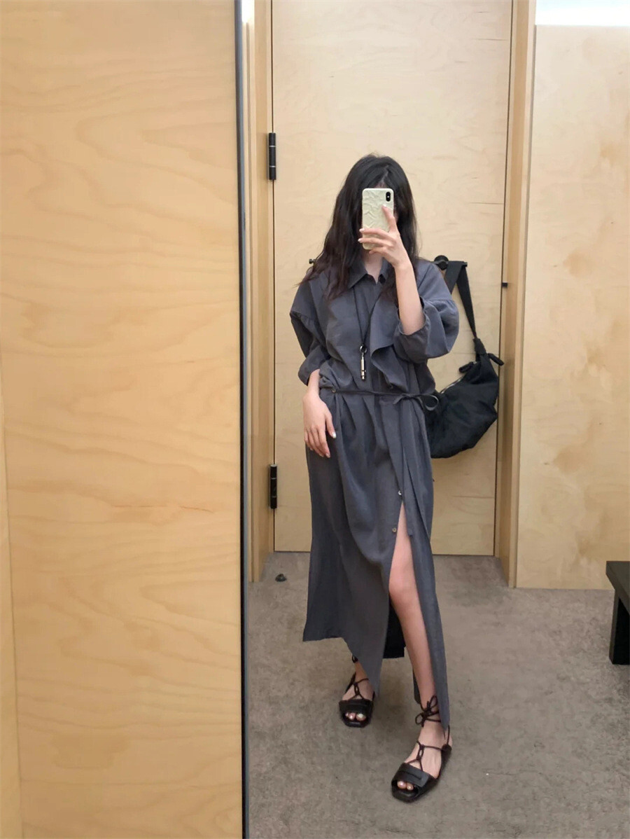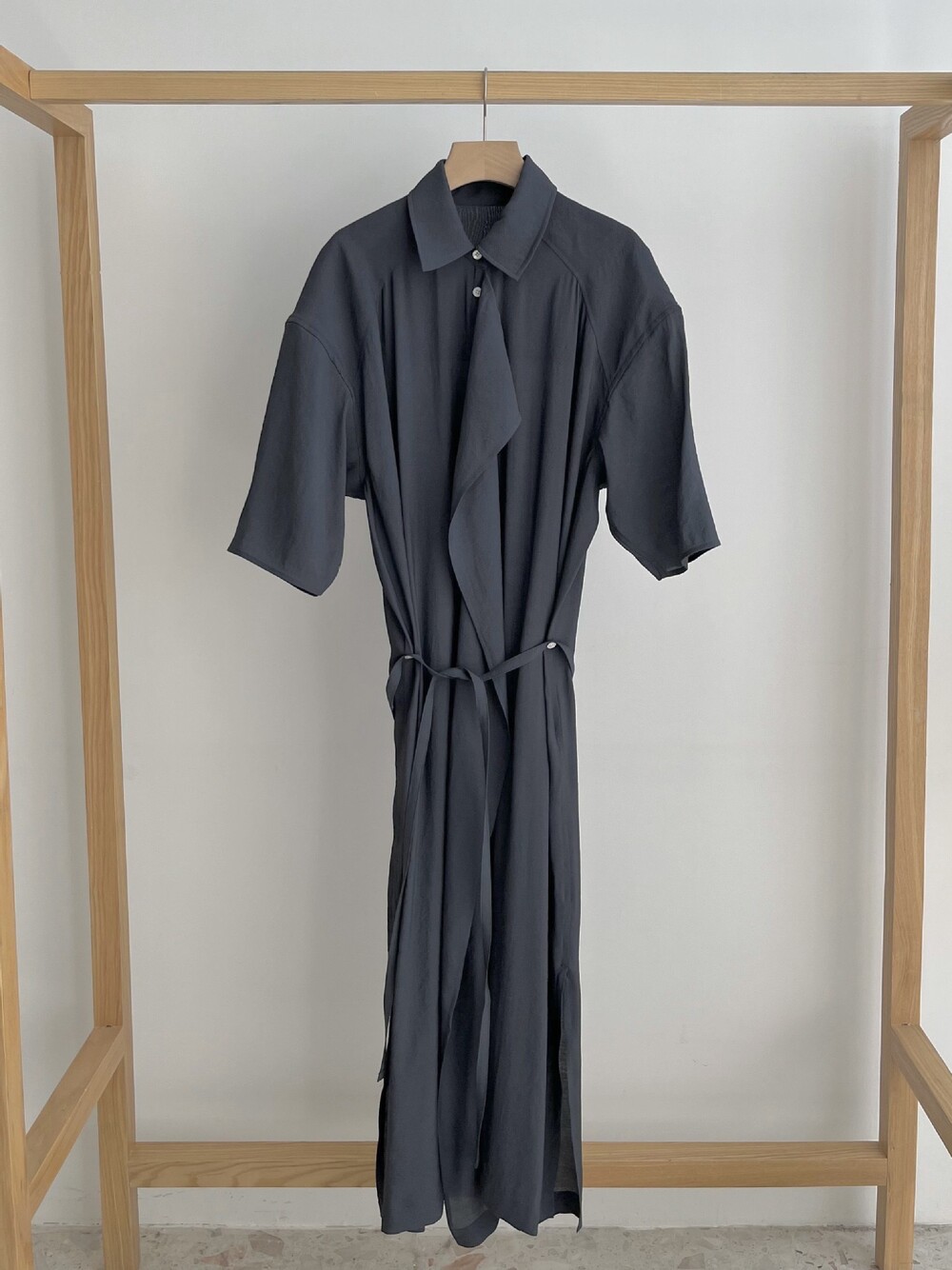 여유로운 실루엣과 넥 라인이 매력적인 셔츠 드레스입니다. 은은한 광택과 사선으로 흐르는 듯한 옷깃이 바쁜 도심 속 일상에 부드러운 여유를 더합니다. 허리의 끈 디테일을 활용해 다양한 실루엣으로 연출할 수 있습니다.