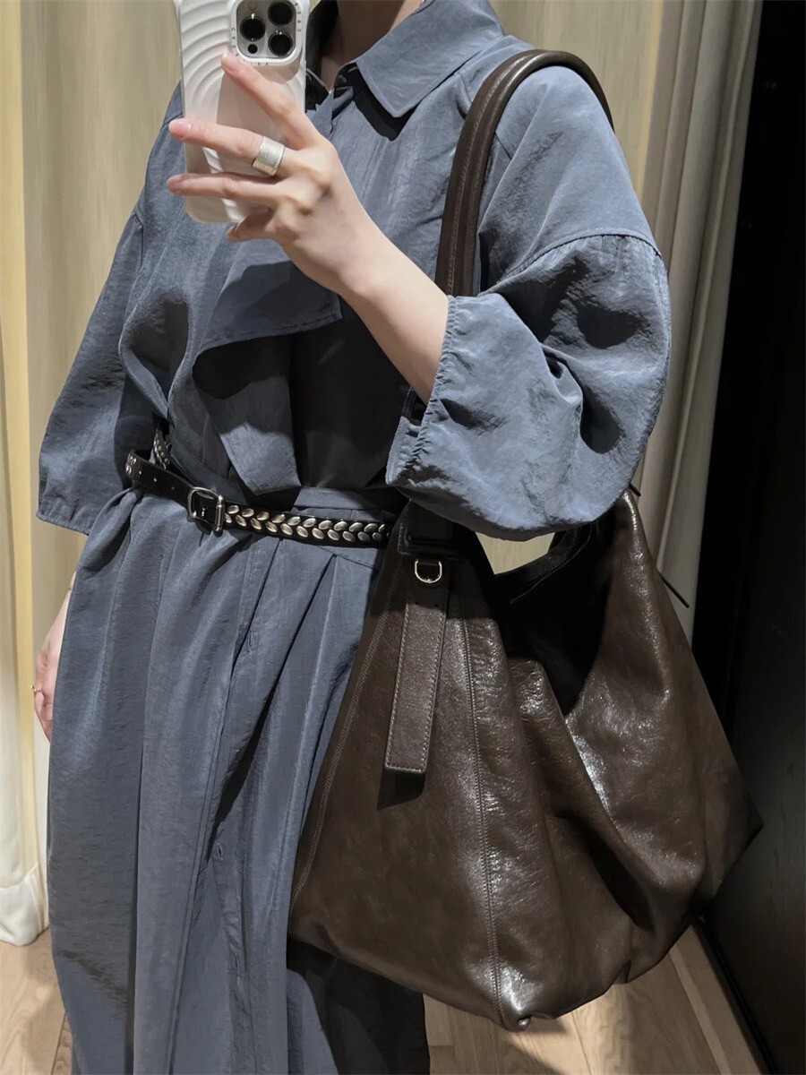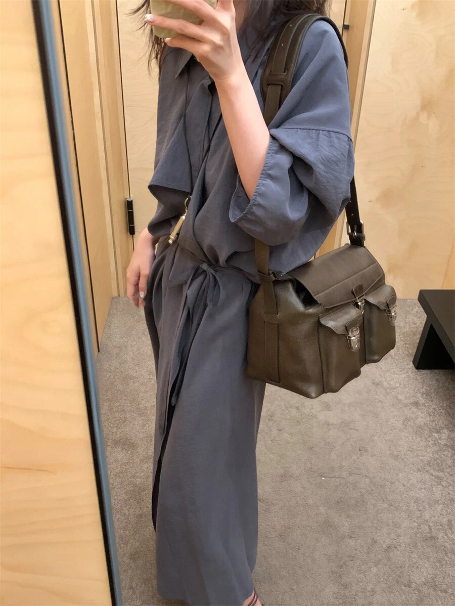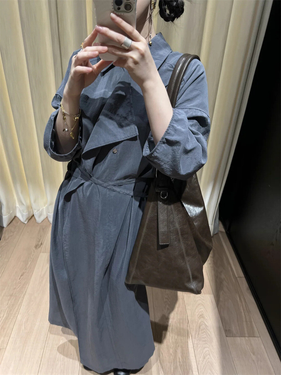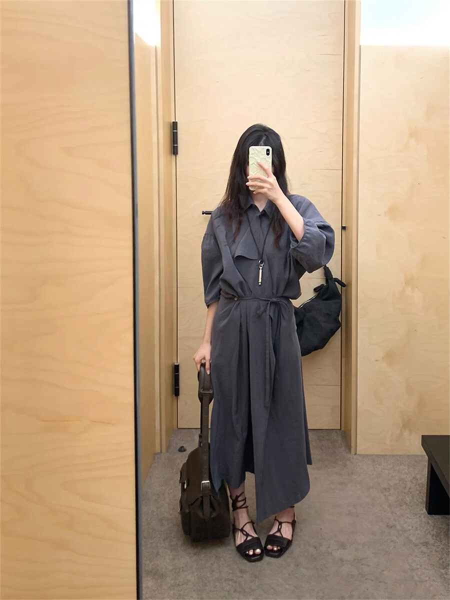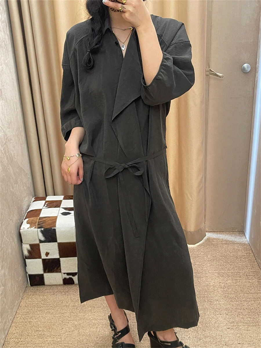 여유로운 실루엣과 넥 라인이 매력적인 셔츠 드레스입니다. 은은한 광택과 사선으로 흐르는 듯한 옷깃이 바쁜 도심 속 일상에 부드러운 여유를 더합니다. 허리의 끈 디테일을 활용해 다양한 실루엣으로 연출할 수 있습니다.
