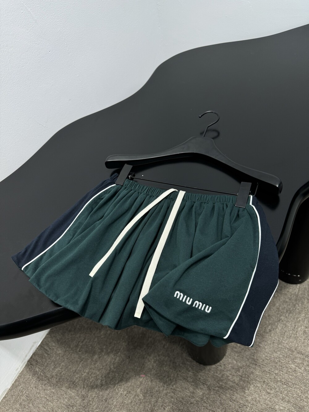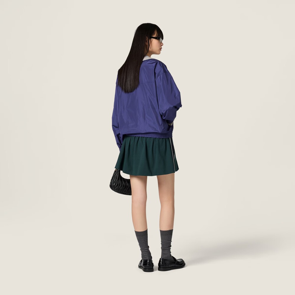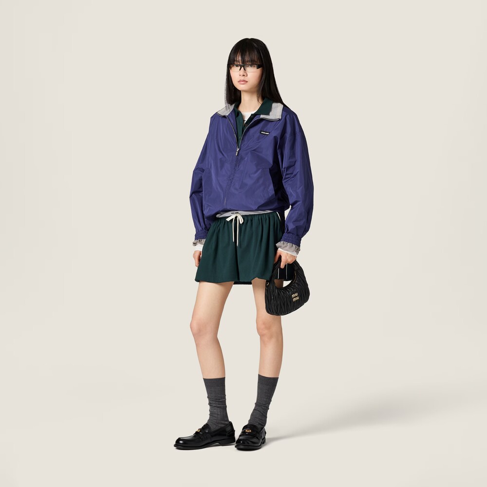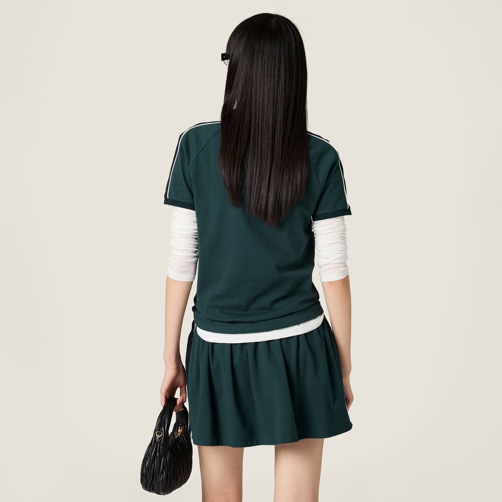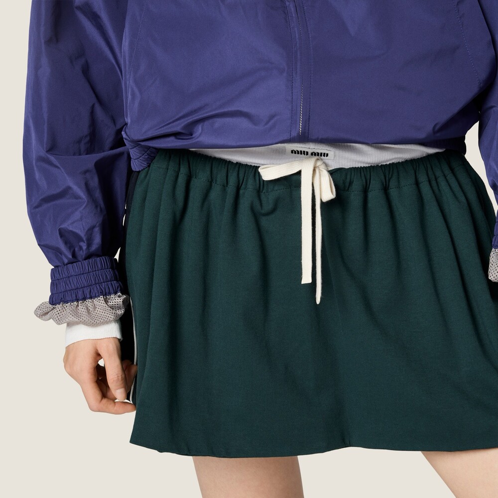 빈티지 스포츠웨어에서 영감을 받은 저지 미니스커트입니다. 측면의 레이싱 스트라이프와 스포티한 파이핑 디테일이 미우미우의 아이코닉한 코드 및 높은 활용도와 조화를 이룹니다.